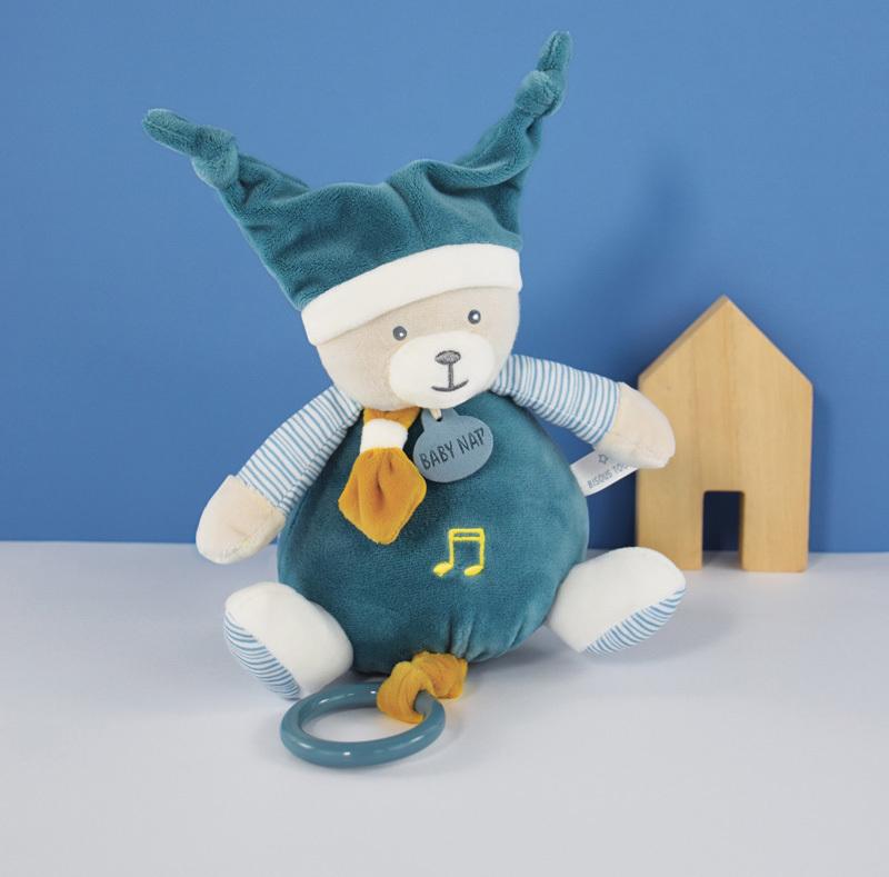Λούτρινο αρκουδάκι 19 εκατοστών σε πετρόλ χρώμα με μουσική, από τη γαλλική εταιρία Doudou et Compagnie.