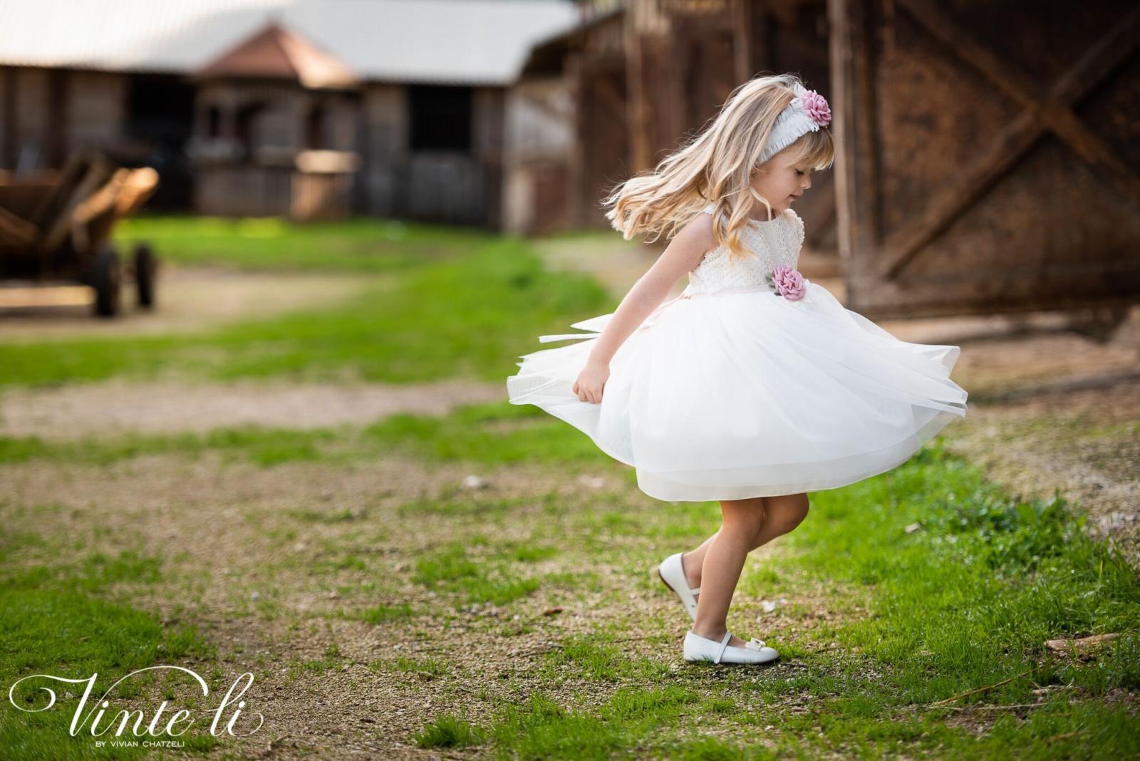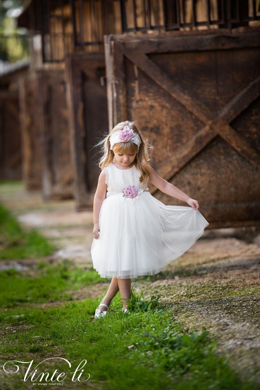 Φόρεμα μεσάτο με μπεζ βαμβακερή δαντέλα στο μπούστο, τούλινη φούστα και χειροποίητο ντεκόρ. Συνοδεύεται από κλειστή ελαστική κορδέλα για τα μαλλιά. Σετ 2 τεμαχίων.