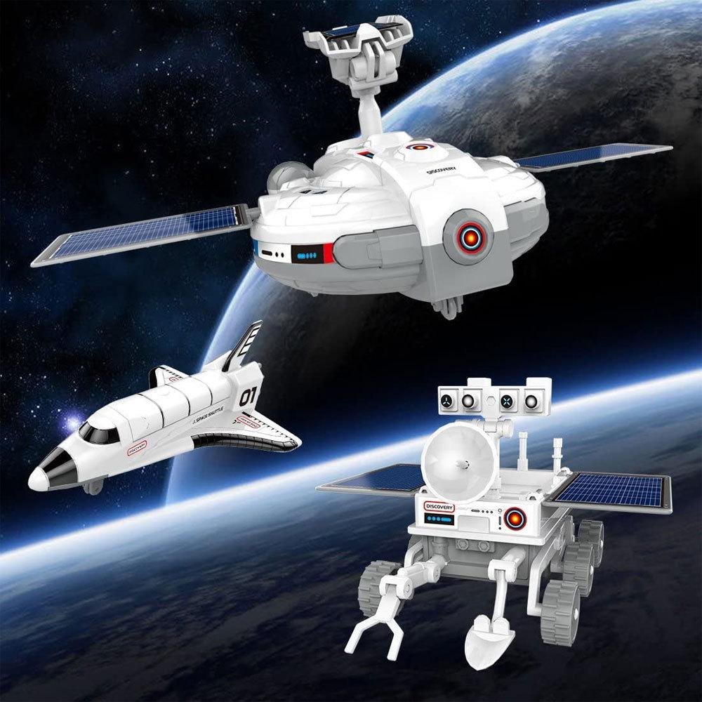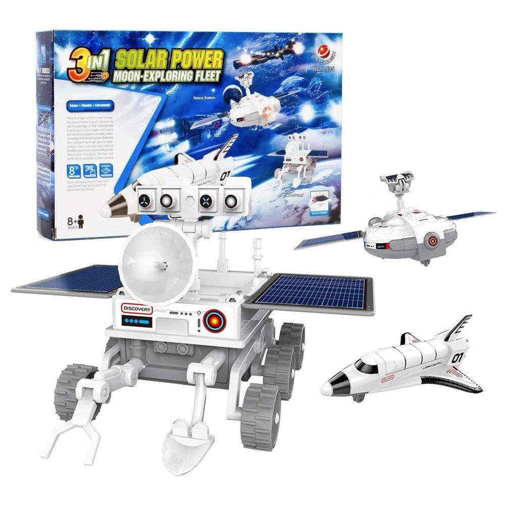 Κατασκευάστε τον δικό σας διαστημικό στόλο εξερεύνησης στο φεγγάρι που μπορεί και κινείται με το φως! Με το ηλιακό σετ κατασκευής 3 σε 1 μπορούμε να κατασκευάσουμε ένα διαστημικό σταθμό (23,5 x 10,5 x 12,5 εκ), ένα διαστημικό λεωφορείο (13,8 x 6,5 x 10 εκ) και ένα διαστημικό τροχοφόρο (11,2 x 7,5 x 11,2 εκ). Μόλις εγκαταστήσουμε το φωτοβολταϊκό που περιλαμβάνεται και φωτίσουμε την κατασκευή, μπορούμε να το δούμε να κινείται! Με αυτό τον τρόπο, τα παιδιά απολαμβάνουν τη διαδικασία της κατασκευής, αλλά και εξοικειώνονται με τις εναλλακτικές μορφές ενέργειας, όπως την ηλιακή. Κατάλληλο για ηλικίες άνω των 8 ετών.