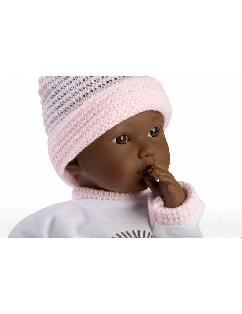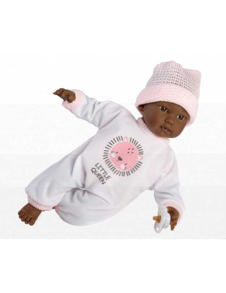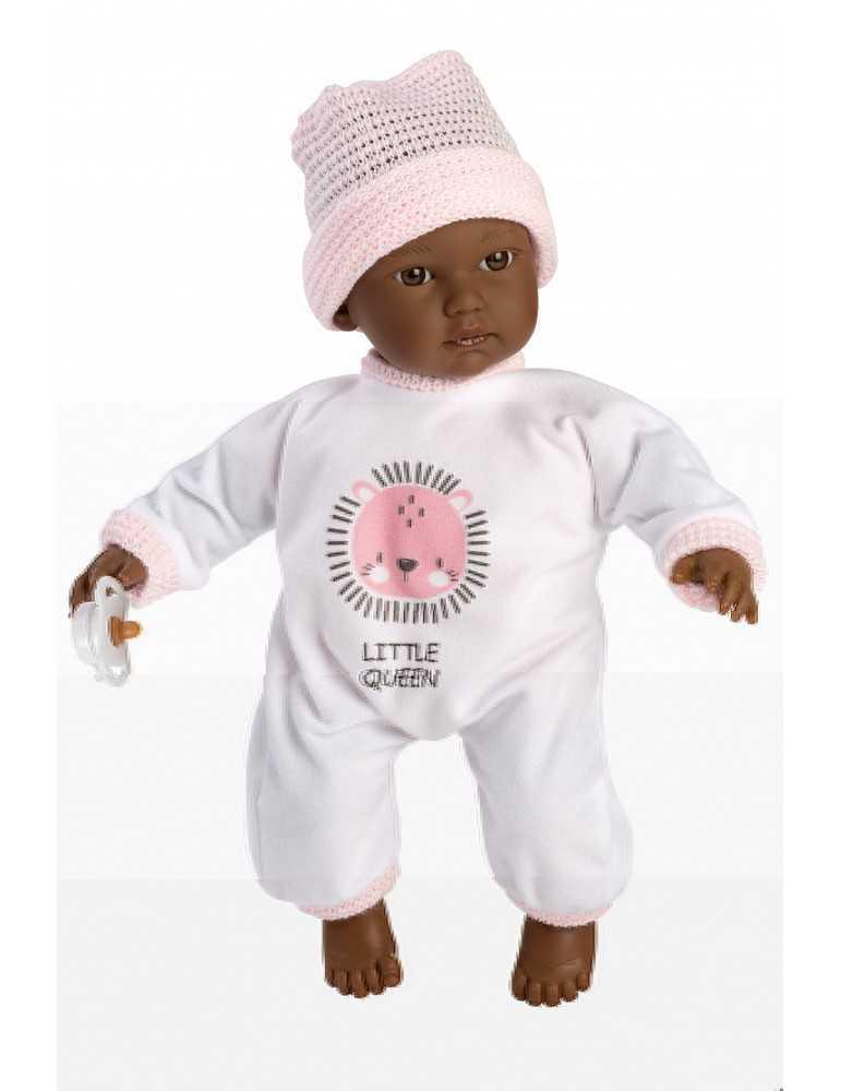 Εκπληκτική κούκλα μαυρο μωρο 30cm σε ,φοραει λευκη φορμα και ροζ σκουφακι πιπίλα και δύο φανταστκά κοτσιδάκια. Κατασκευασμένη στην Ισπανία, βγάζοντας την πιπίλα κλαίει και λέει ” Μαμά.. Μπαμπά…”, όποτε ξαναβάλετε την πιπίλα σταματάει. Φοράει εξαιρετικά ρούχα και έχει εκπληκτικές λεπτομέριες.