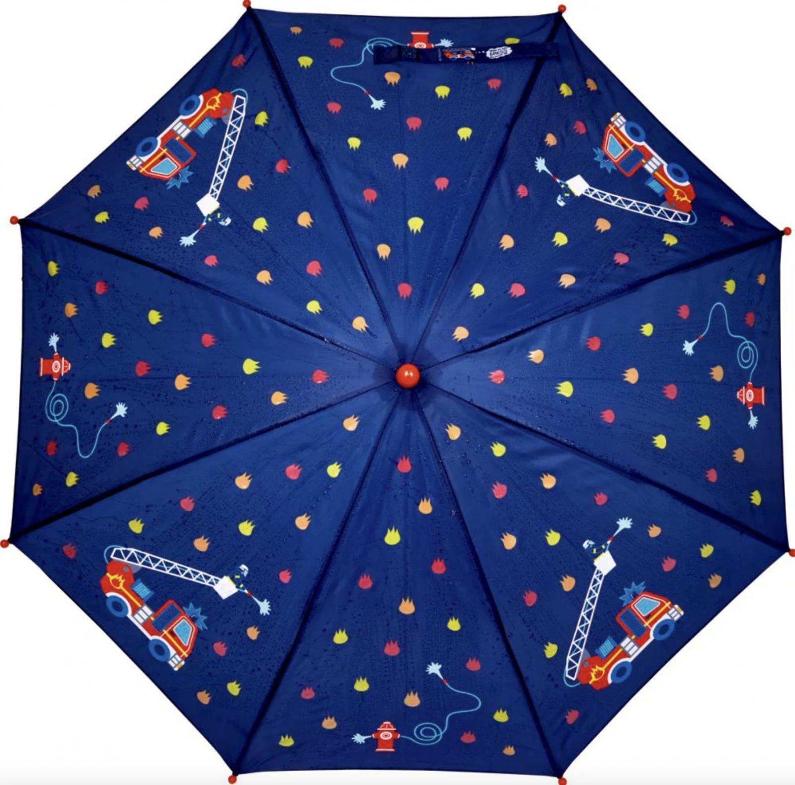 Με αυτή την ομπρέλα, οι μικροί και μεγάλοι πυροσβέστες παραμένουν στεγνοί. Όταν βρέχονται, οι κουκκίδες γίνονται πολύχρωμες σαν δια μαγείας! Η απόχρωση από ανακυκλωμένο πολυεστέρα έχει διάμετρο περίπου 83 cm. Η πλαστική λαβή είναι ασφαλής στα χέρια των μικρών παιδιών. Εγγυημένη μαγεία της βροχής!