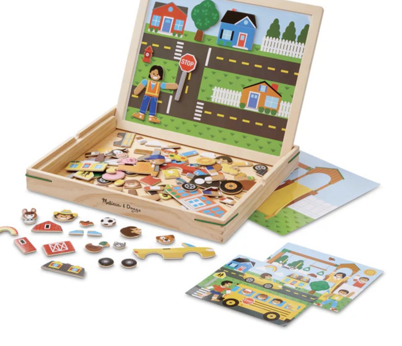 Συνδυάστε περισσότερους από 100 ξύλινους μαγνήτες για να αναδημιουργήσετε και να ζωντανέψετε ευφάνταστες σκηνές! Τοποθετήστε μια μεγάλη σκηνή φόντου στον μαγνητικό πίνακα παιχνιδιού, επιλέξτε μια από τις μικρές κάρτες προτάσεων με το ίδιο φόντο και, στη συνέχεια, βρείτε και τοποθετήστε τους μαγνήτες που ταιριάζουν με την προτεινόμενη εικόνα. Το σετ περιλαμβάνει 119 ξύλινους μαγνήτες, 2 κάρτες φόντου διπλής όψης, 4 κάρτες προτάσεων διπλής όψης, έναν μαγνητικό πίνακα παιχνιδιού που στέκεται σε μια στιβαρή ξύλινη θήκη αποθήκευσης με λαβή. Τα παιδιά τριών και άνω θα διασκεδάσουν ενώ ακονίζουν το λεπτό κινητήρα, ματ