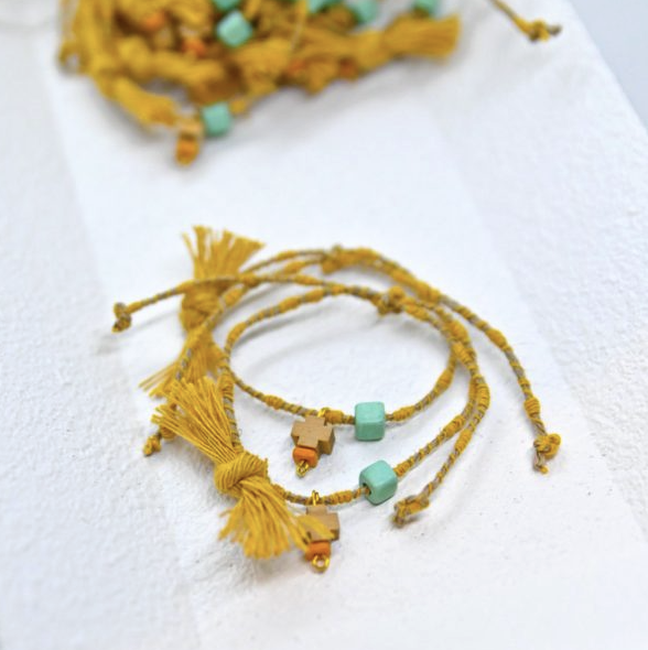 Βραχιόλι με δίχρωμο κορδόνι, ξύλινο σταυρουδάκι και κεραμικά στοιχεία.