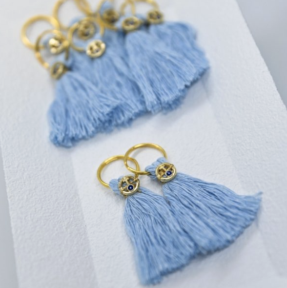 Μπρελόκ φούντα με επίχρυσο σταυρό με σμάλτο ματάκι.