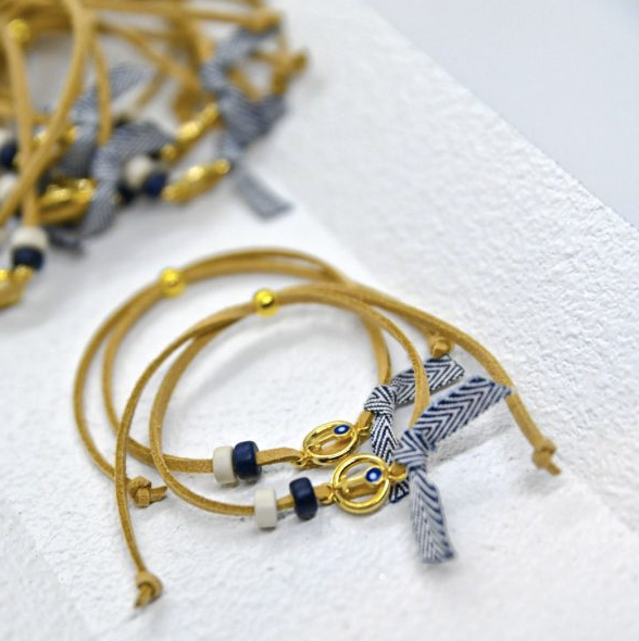 Βραχιόλι σουέτ με επίχρυσο σταυρό και σμάλτο ματάκι.