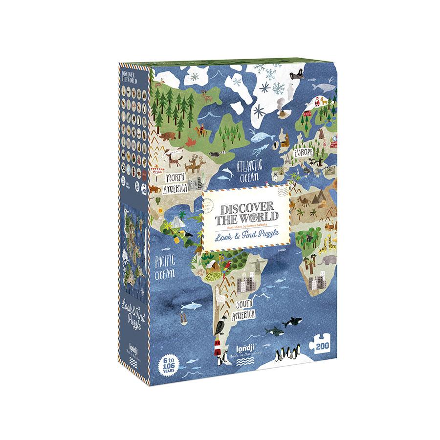 Το παζλ 200 κομματιών της Londji “Ανακαλύψτε τον Κόσμο” εγγυάται ατελείωτες ώρες διασκέδασης. Η συσκευασία περιλαμβάνει 34 μικρές κάρτες με μνημεία και ζώα, τις οποίες πρέπει να εντοπίσετε μέσα στην εικόνα του παζλ. Εκπαιδευτικό παιχνίδι που θα βοηθήσει τα παιδιά πρωτοσχολικής ηλικίας να ανακαλύψουν πληροφορίες για τον κόσμο που ζούμε. Κατασκευασμένο από 100% ανακυκλωμένα υλικά και σχεδιασμένο στην Βαρκελώνη από την ισπανική εταιρία Londji. Διαστάσεις παζλ: 67 x 48 εκ.