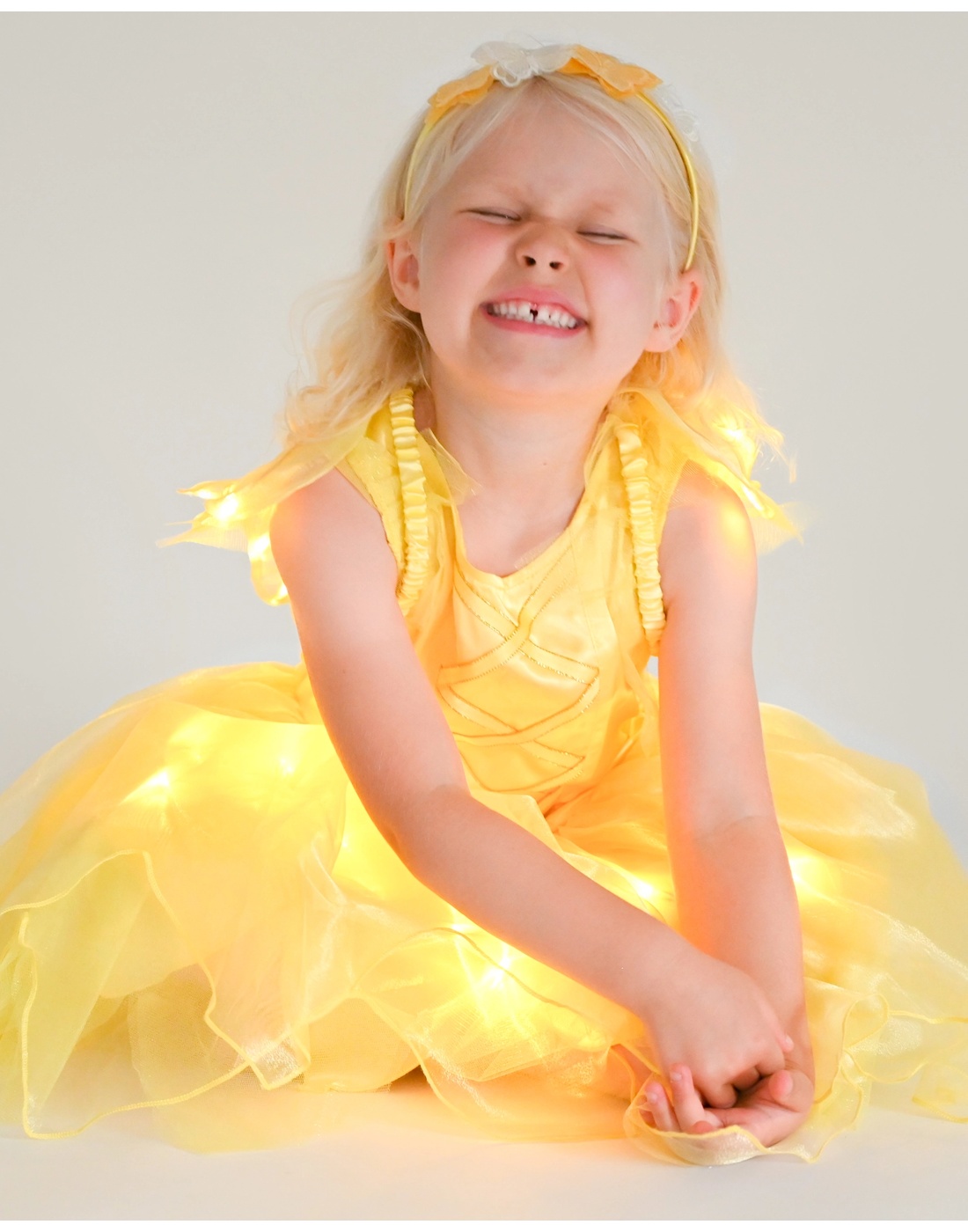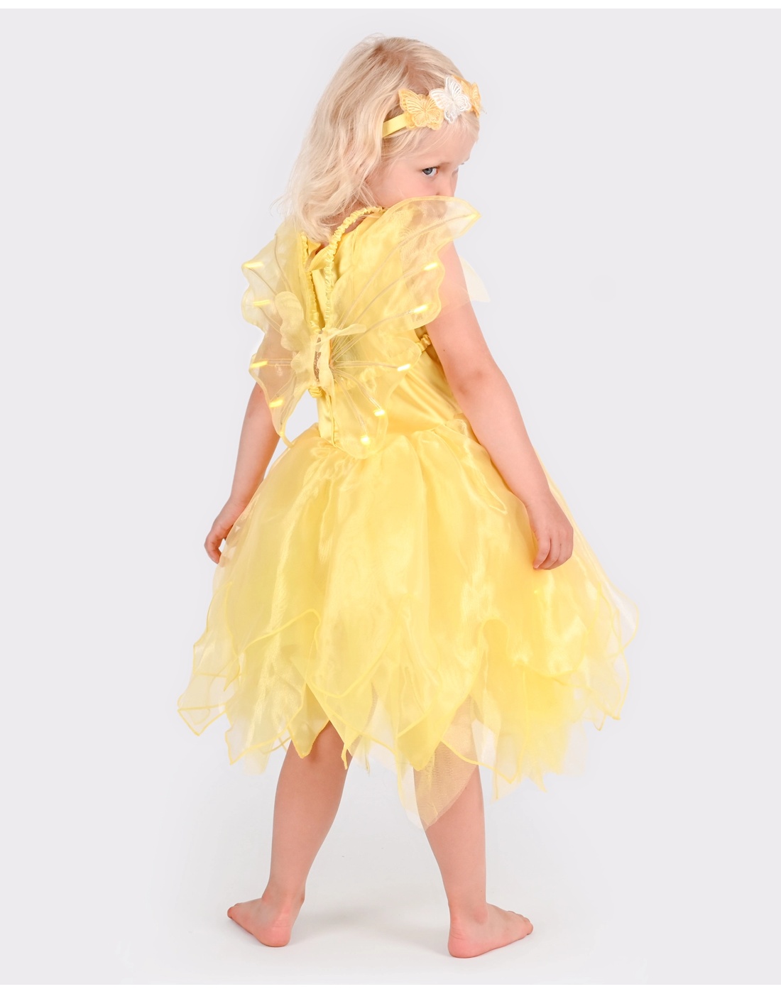 Παιδική στολή νεράιδας σε κίτρινο χρώμα με φόρεμα από τούλι και ενσωματωμένα φωτάκια, που προσδίδουν εντυπωσιακή εμφάνιση. Διαθέτει διάφανα φτερά και άνετη εφαρμογή, κατάλληλη για πολύωρη χρήση.