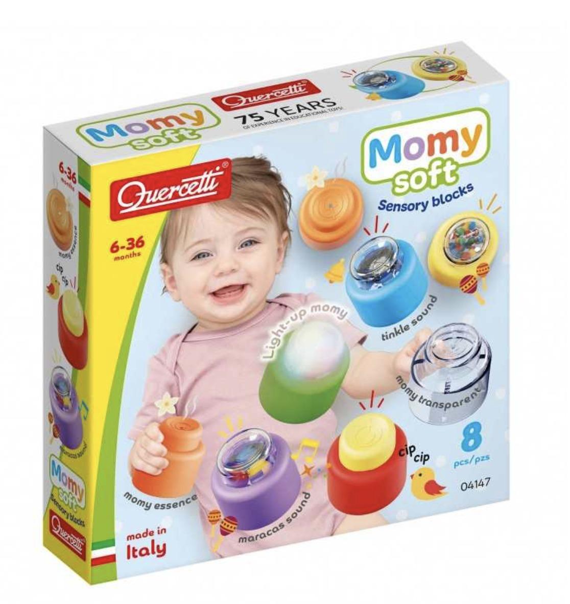 Εξερευνήστε το Momy Sensory από την Quercetti, ένα σετ από 8 μεγάλα μαλακά τουβλάκια σχεδιασμένα να ενεργοποιούν όλες τις αισθήσεις των παιδιών ηλικίας 6 έως 36 μηνών. Κάθε τουβλάκι προσφέρει μια μοναδική εμπειρία: ήχους (μαράκες, κελάηδισμα), φώτα και ποικίλες υφές που ενισχύουν την αισθητηριακή ανάπτυξη, τον συντονισμό και την περιέργεια!