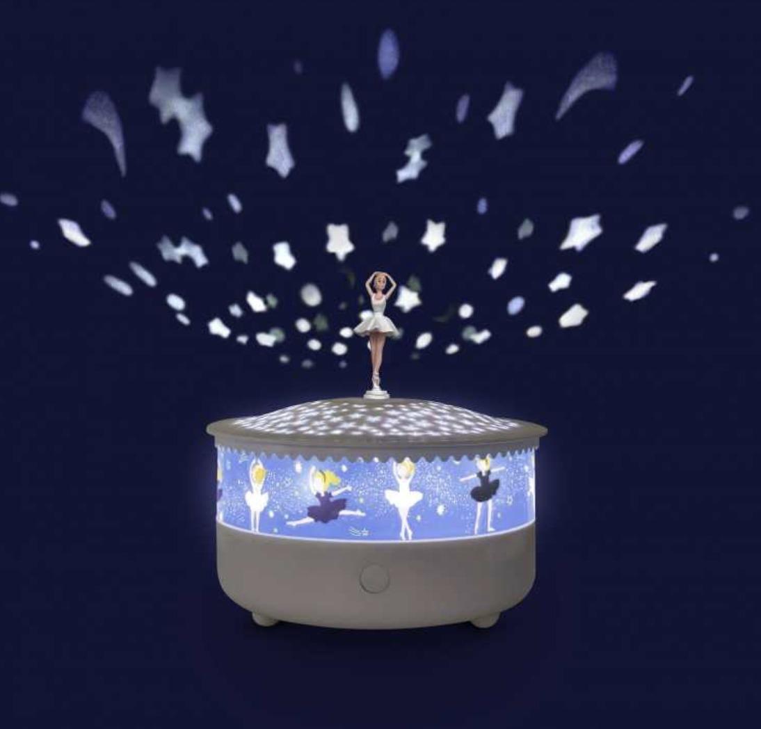 Το νυχτερινό μας φως φωτίζει απαλά το δωμάτιο του παιδιού σας. Μπορείτε να ενεργοποιήσετε την περιστροφή του ειδωλίου, το διακριτική προβολή λευκών αστεριών και χειροκίνητος άνεμος νανουρίστε όπως θέλετε. Για να διατηρήσετε την μπαταρία .Το νυχτερινό φως σβήνει αυτόματα μετά από 15 λεπτά και επανενεργοποιείται σε περίπτωση θορύβου εάν ο «ανιχνευτής κλάματος» η λειτουργία είναι ενεργοποιημένη. Επαναφορτιζόμενη με “micro USB”.