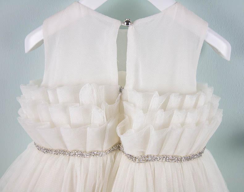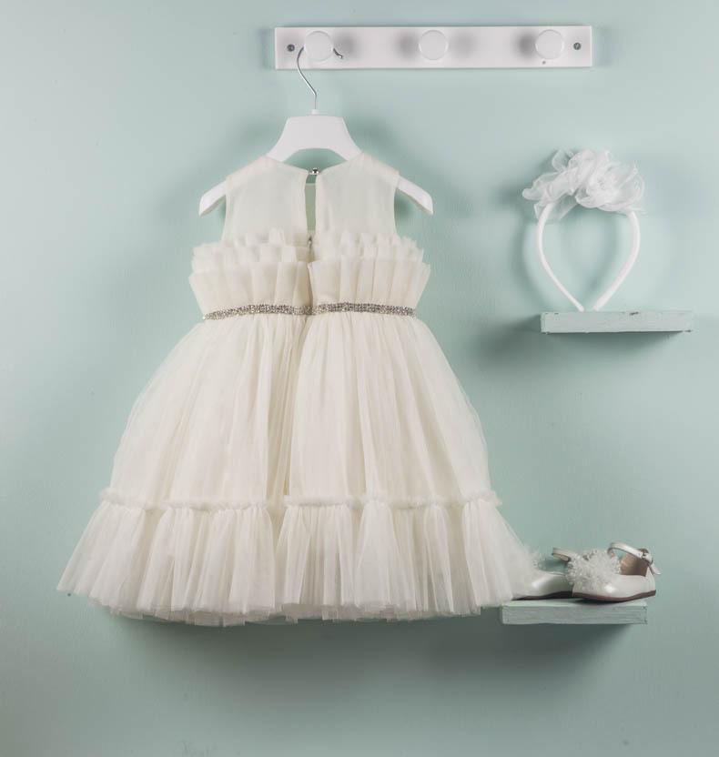 Η Adele είναι ένα αέρινο τούλινο φόρεμα σε ιβουάρ χρώμα εξαιρετικής ποιότητας, διακοσμημένο με petit βολάν και τρέσα με κρύσταλλα swarovski στη μέση. Συνοδεύεται για το κεφάλι με μία στέκα που την κοσμούν χειροποίητα εκρού λουλούδια από οργάντζα.