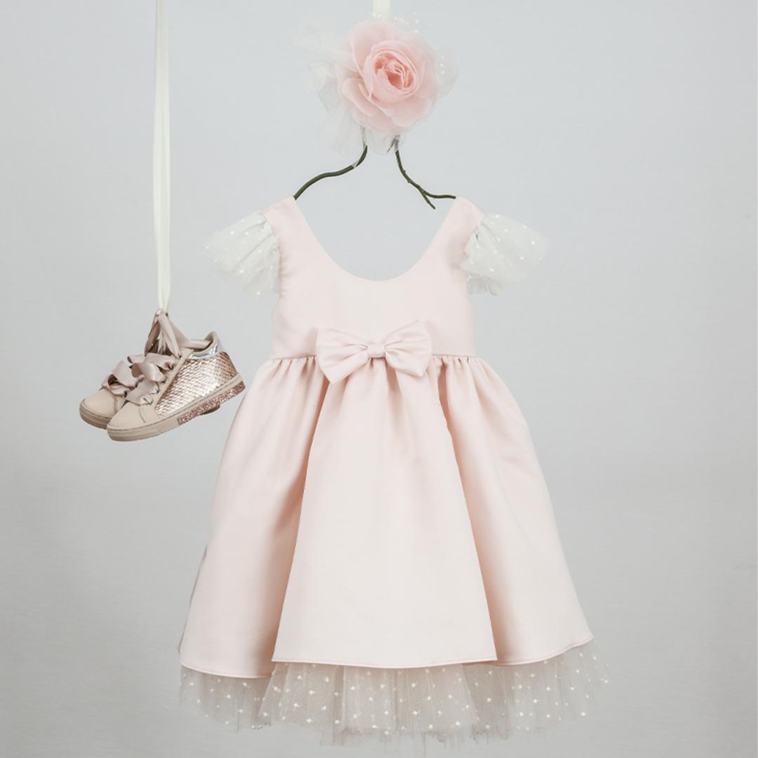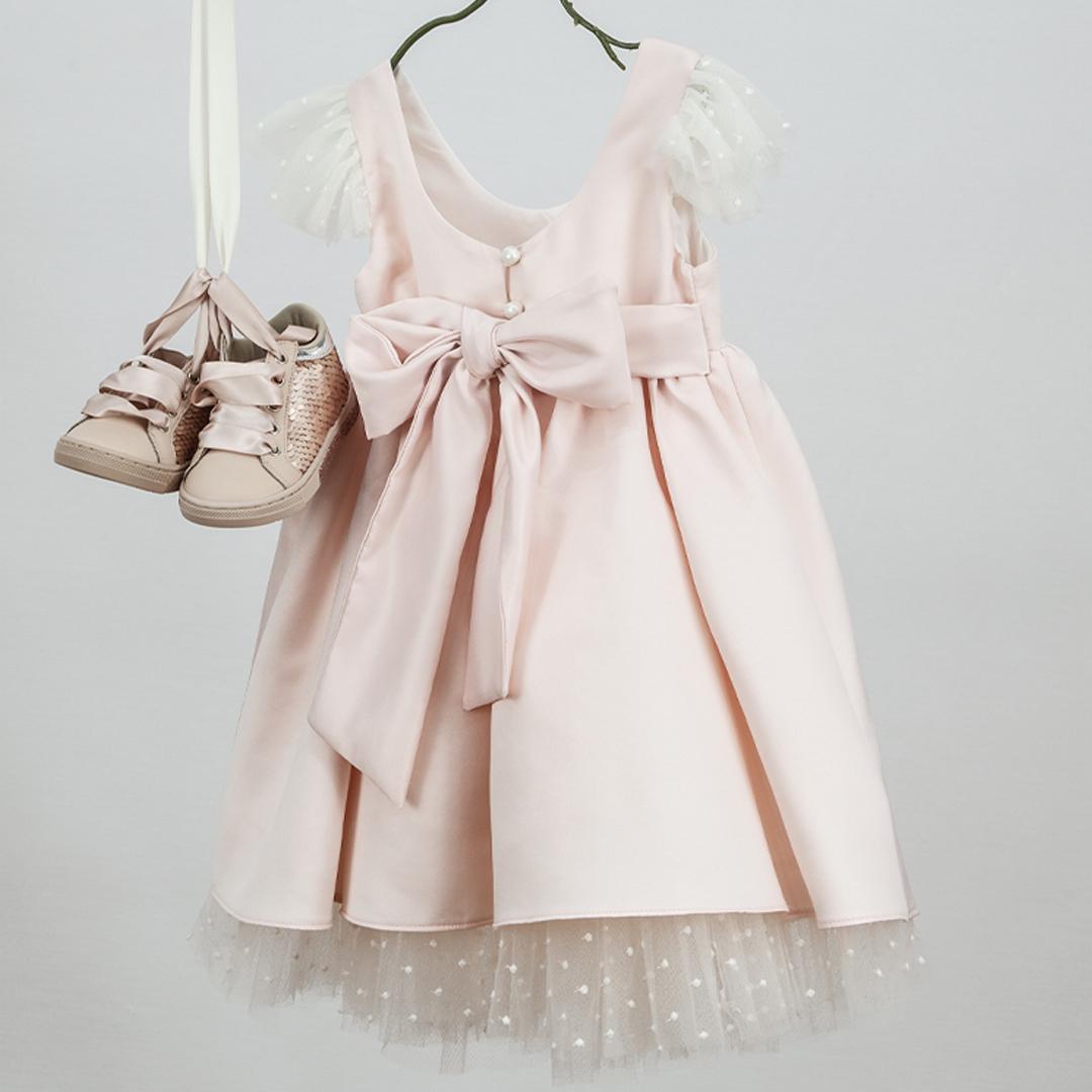 Aimiliani-9317: Η Aimilianiείναι ένα κομψό βαπτιστικό φόρεμα από σατέν εξαιρετικής ποιότητας σε light-pinkχρώμα. Το petitιβουάρ βολάν κάνει το ρούχο ιδιαίτερα ρομαντικό. Συνοδεύεται από κορδέλα με χειροποίητα λουλούδια.