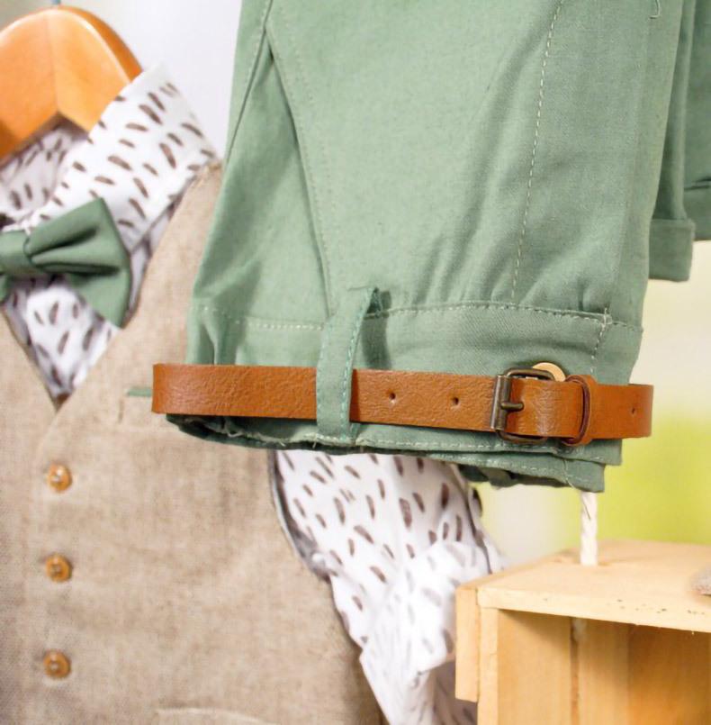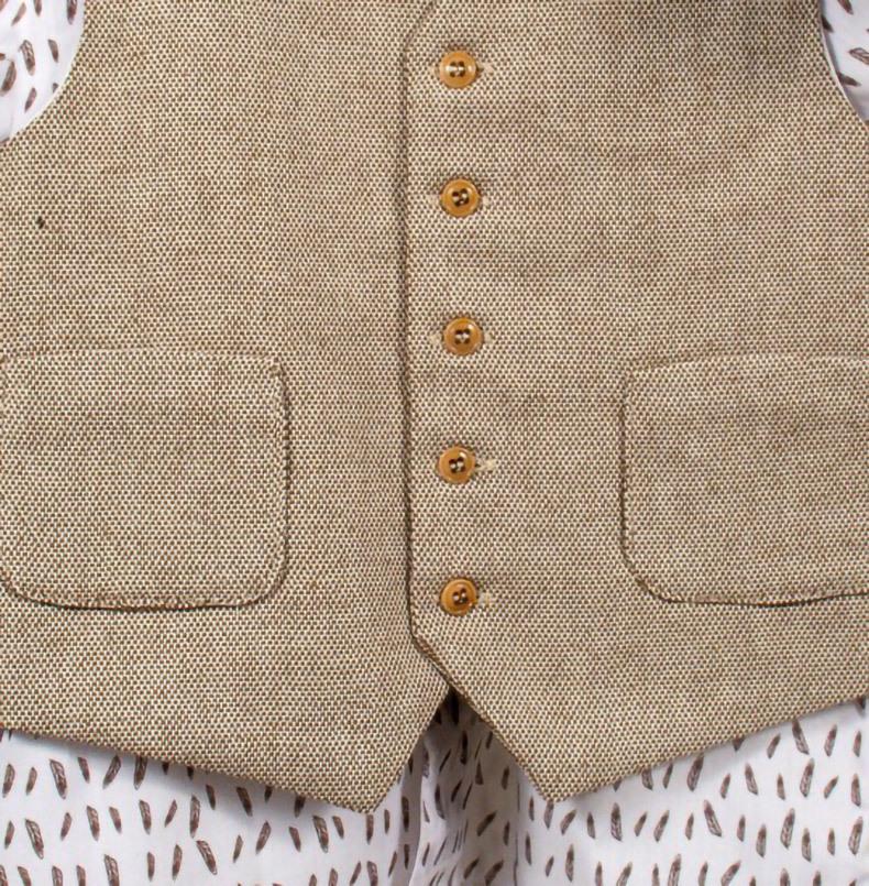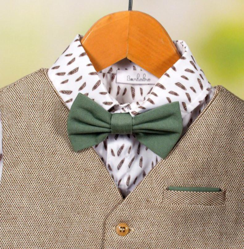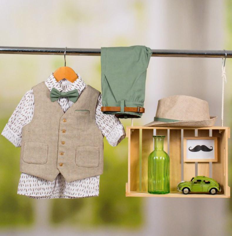 Ο Apostolis είναι ένα κομψό βαπτιστικό κουστούμι με μπεζ γιλέκο ψάθα με κουμπιά, πουκάμισο cotton με Indian print φτερά και green παντελόνι.