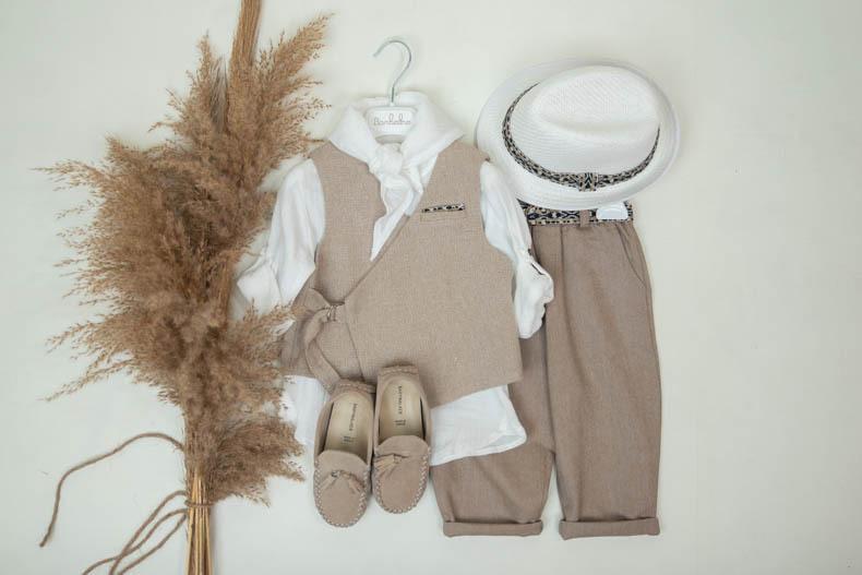 Ο Arnold είναι ένα σοκολά μονόχρωμο σύνολο βάπτισης must have για αγόρι. Αποτελείται από ιδιαίτερο γιλέκο απο exclusive ψάθα, λευκό loose fit πουκαμίσα και σοκολά παντελόνι με ιδιαίτερο κόψιμο και ζώνη που του δίνει μια boho ρότα. Αξεσουάρ το φουλάρι και το ψάθινο λευκό καβουράκι για το κεφάλι.