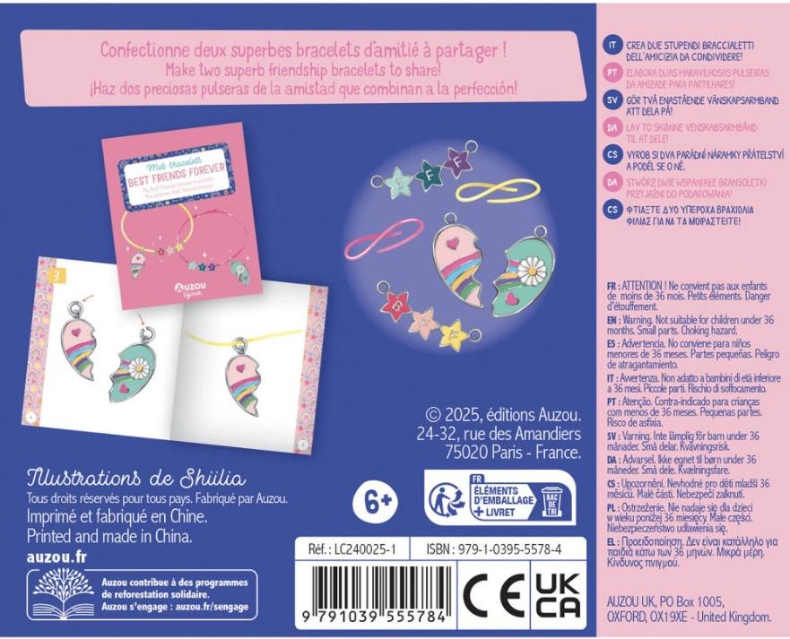 Γνωρίστε την ικανοποίηση και την απόλαυση του να φοράτε ένα κόσμημα που έχετε φτιάξει μόνοι σας! Η σειρά «Φτιάχνω Κοσμήματα», της αγαπημένης μας γαλλικής εταιρίας Auzou, διαθέτει μεγάλη γκάμα από πρωτότυπα, μοντέρνα και δημιουργικά κιτ κατασκευής κοσμημάτων. Βραχιόλια, κολιέ, δαχτυλίδια και πολλά άλλα, ανακαλύψτε τα όλα και δημιουργήστε τις πιο μοναδικές και καταπληκτικές συλλογές αξεσουάρ και κοσμημάτων! Το συγκεκριμένο κιτ περιλαμβάνει όλα όσα θα χρειαστείτε για να φτιάξετε 2 υπέροχα ασορτί βραχιόλια φιλίας για εσάς και τη καλύτερη φίλη σας. Περιλαμβάνεται φυλλάδιο με αναλυτικές οδηγίες βήμα-βήμα.