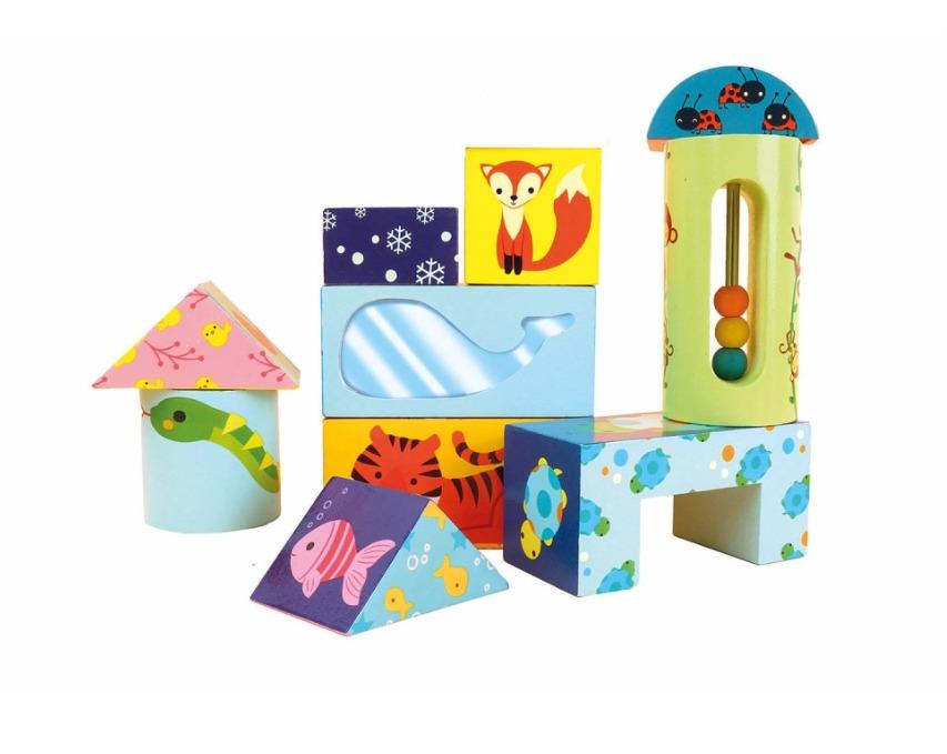 Τα μωρά και τα παιδιά θα απολαύσουν πολύτιμες πρώτες στιγμές παιχνιδιού με τη σειρά από ξύλινα παιχνίδια υψηλής ποιότητας που θα διαρκέσουν για χρόνια. Η αλληλεπίδραση με τα χρωματιστά, απαλά καμπυλωτά ξύλινα κομμάτια θα βοηθήσει τα μικρά να αναπτύξουν βασικές δεξιότητες και να απολαύσουν την εξερεύνηση του κόσμου γύρω τους. Στο συγκεκριμένο παιχνίδι περιλαμβάνονται 13 κύβοι για να στοιβάξετε, εκ των οποίων 4 κύβοι παράγουν ήχο και 1 κύβος διαθέτει καθρέπτη.