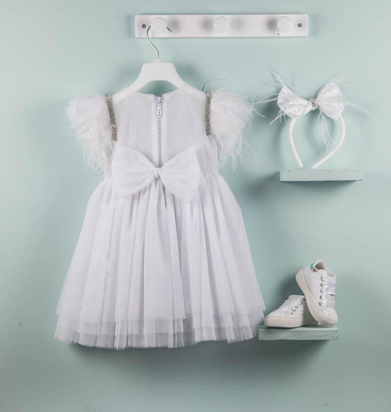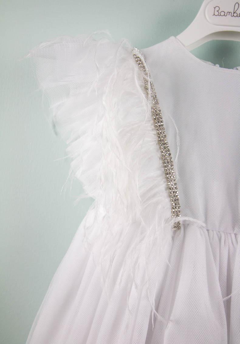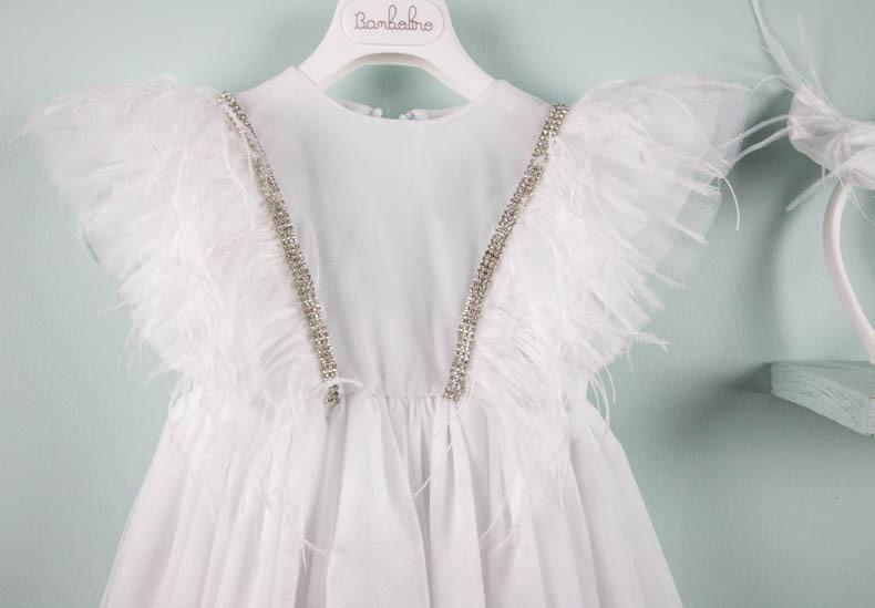 Η Belinda είναι ένα κομψό φόρεμα σε λευκό χρώμα από φίνο τούλι διακοσμημένο με μοναδικά φτερά και τρέσα swarovski. Έχει διάφανη πλάτη και τεράστιο φιόγκο στο πίσω μέρος του φουστανιού. Εσωτερικά είναι επενδυμένο από 100% βαμβακερό ύφασμα. Αξεσουάρ για το κεφάλι μια handmade exclusive στέκα που θα σας καταπλήξει.