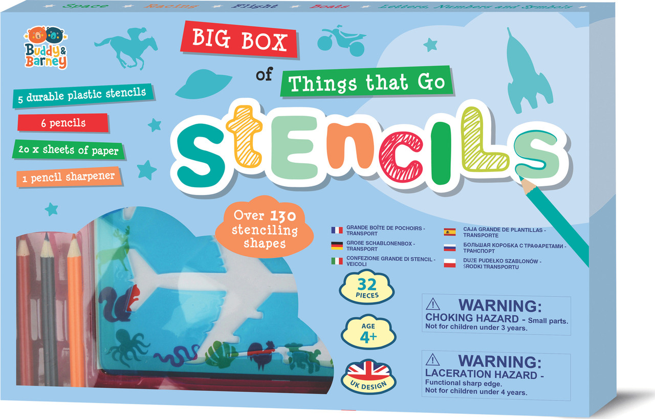 Ψυχαγωγήστε τα παιδιά σας με το σετ τέχνης με θέμα Things That Go της Buddy & Barney, με πάνω από 130 διαφορετικά σχήματα σχεδιασμένα για να εμπνεύσουν τη δημιουργικότητα και τη φαντασία σε μικρούς καλλιτέχνες. Με στιβαρά και εύκαμπτα στένσιλ, το σετ της Buddy & Barney είναι εύκολο για παιδιά όλων των ηλικιών και καλλιτεχνικών ικανοτήτων να σχεδιάσουν και να χρωματίσουν χιλιάδες σχέδια και μοτίβα.