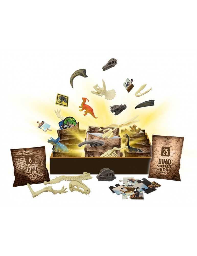 Ένα κουτί που περιέχει 25 φακελάκια-έκλπηξη με θέμα δεινοσαύρους. Ανοίξτε τες και δείτε την έκπληξη σας. Κονκάρδες, παζλ, σκελετοί για συναρμοολόγηση, φιγούρες και δόντια δεινοσαύρων για να γίνουν κολλιέ. Οι τσάντες αριθμούνται 1-25 το πακέτο μπορεί να χρησιμοποηθεί ως advencalendar.