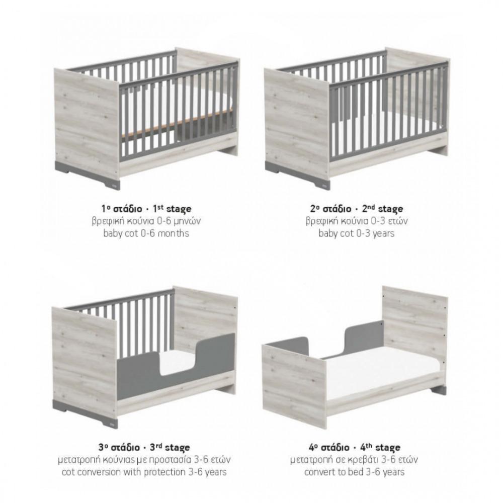Η διάσταση της κούνιας είναι 145 x 78 x 88 cm, ενώ μετά τη μετατροπή της σε κρεβατάκι, οι διαστάσεις παραμένουν ίδιες