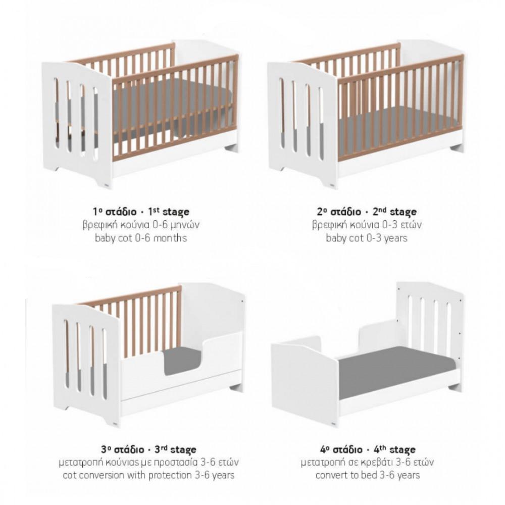 Η διάσταση της κούνιας είναι 144 x 78 x 91 cm, ενώ μετά τη μετατροπή της σε κρεβατάκι, οι διαστάσεις παραμένουν ίδιες