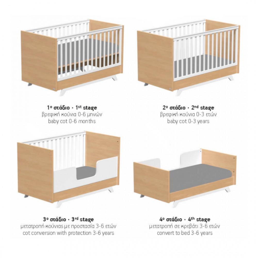 Η διάσταση της κούνιας, (145 X 78 X 88 cm) παραμένει ίδια και μετά τη μετατροπή της σε κρεβατάκι