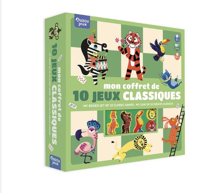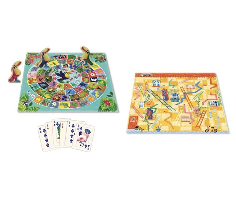 Ένα σετ που συγκεντρώνει όλα τα πολυαγαπημένα, κλασσικά επιτραπέζια παιχνίδια, ντάμα, το παιχνίδι της χήνας, γκρινιάρη και φιδάκι, καθώς και 54 τραπουλόχαρτα με οδηγίες για 6 κλασσικά παιχνίδια καρτών. Περιεχόμενα: 40 ξύλινα πιόνια ντάμας, 16 ξύλινες ζέβρες, 4 ξύλινα τουκάν, 4 ξύλινοι σκύλοι και γάτες, 2 ξύλινα ζάρια, 54 κάρτες, 2 ταμπλό παιχνιδιού διπλής όψεως. Αριθμός παικτών: 2-5. Μέση διάρκεια παιχνιδιού: 20 λεπτά. Διαστάσεις συσκευασίας:30 x 30 x 3.5 εκ.