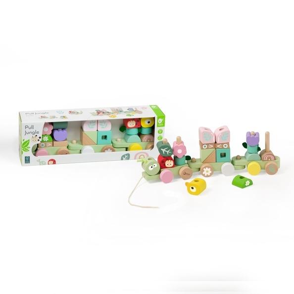 Το συρόμενο τρενάκι περιλαμβάνει λουλούδια, πουλιά, πεταλούδες, φύλλα και διάφορα οικοδομικά τουβλάκια. Τα παιδιά μπορούν να ανακατεύουν ελεύθερα και να ταιριάζουν τα κομμάτια με θέμα τη ζούγκλα. Το θέμα της ζούγκλας εισάγει τα παιδιά στον φυσικό κόσμο, διδάσκοντάς τους για τα ζώα, τα φυτά και τα έντομα ενθαρρύνοντας το ενδιαφέρον για τη φύση και τη περιβαλλοντική συνείδηση.