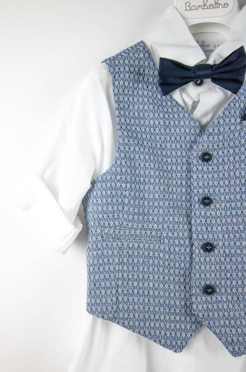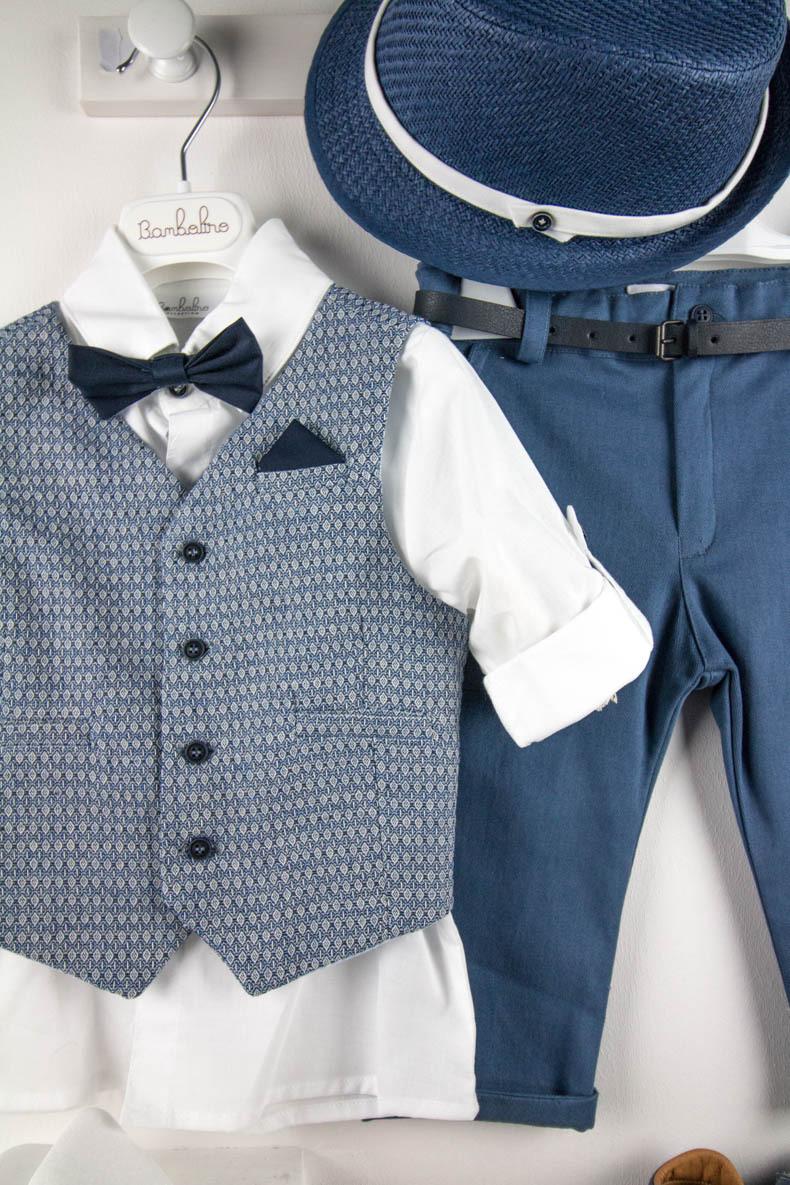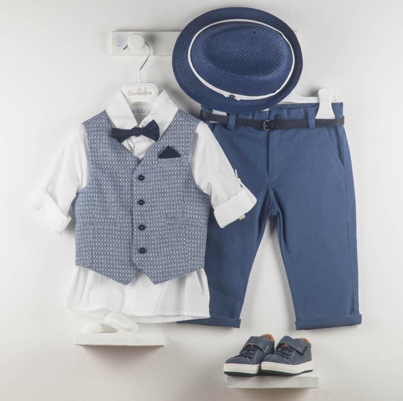 Ο Dario είναι ιδιαίτερο βαπτιστικό σετ. Αποτελείται από ραφ παντελόνι, λευκό πουκάμισο και μπλε γιλέκο. Το σετ ολοκληρώνει το μπλε παπιγιόν, η μπλε ζώνη και το μπλε καβούρι