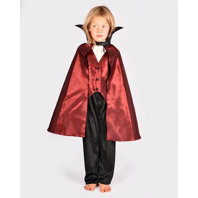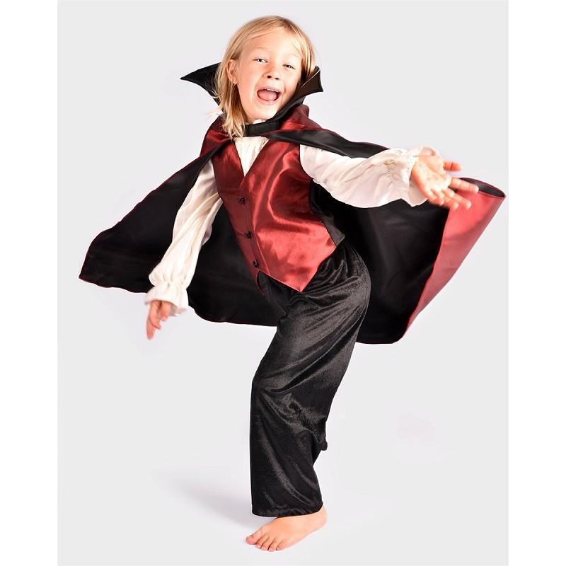 Κοστούμι Δράκουλα. Αποτελείται από 4 κομμάτια. Μαύρο βελούδινο παντελόνι, κόκκινη κάπα με ψηλό γιακά και κούμπωμα στο μπροστινό μέρος, κόκκινο γιλέκο και λευκό γιακά από μεσα