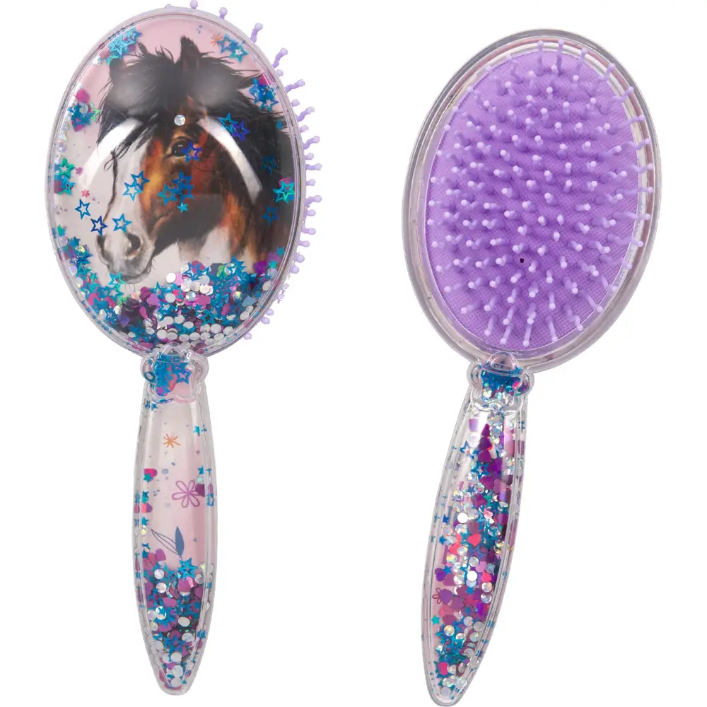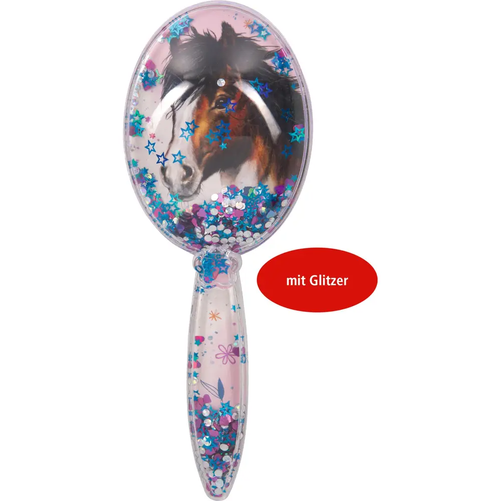 Πρόκειται για μια παιδική βούρτσα μαλλιών με σχέδιο αλόγου και κινούμενα γκλίτερ (παγιέτες). Είναι προϊόν της σειράς “Horse Friends” από τη μάρκα Die Spiegelburg (Coppenrath Verlag).