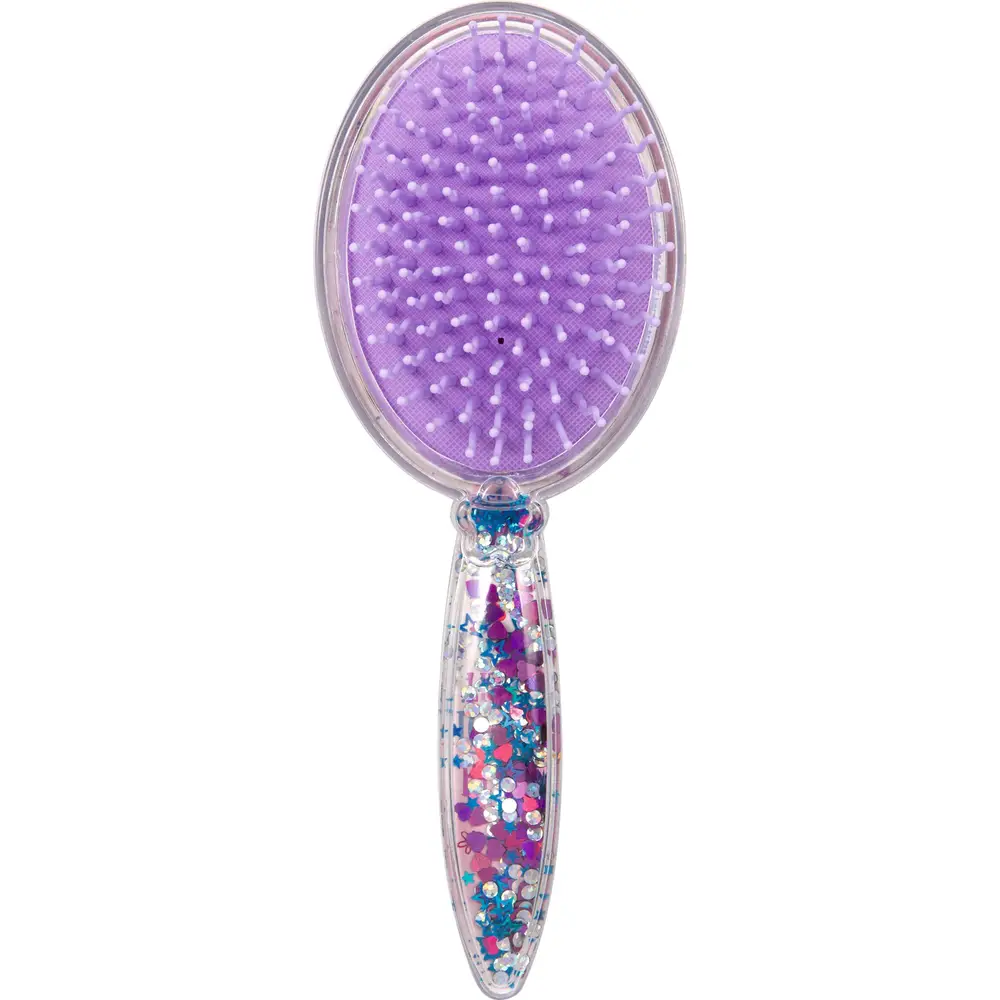 Σχεδιασμός: Η βούρτσα έχει οβάλ σχήμα με διαφανή πλάτη γεμάτη με κινούμενες αστραφτερές παγιέτες σε μπλε, μωβ και ροζ αποχρώσεις, καθώς και ένα σχέδιο κεφαλής αλόγου.