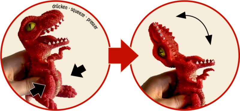 Πρόκειται για μικρές φιγούρες δεινοσαύρων T-Rex, συχνά από σιλικόνη ή πλαστικό, με κινητό σαγόνι που ανοιγοκλείνει όταν πιεστεί το σώμα τους. Είναι διαθέσιμες σε διάφορα χρώματα, όπως φαίνεται στην εικόνα (καφέ, πράσινο, κόκκινο)