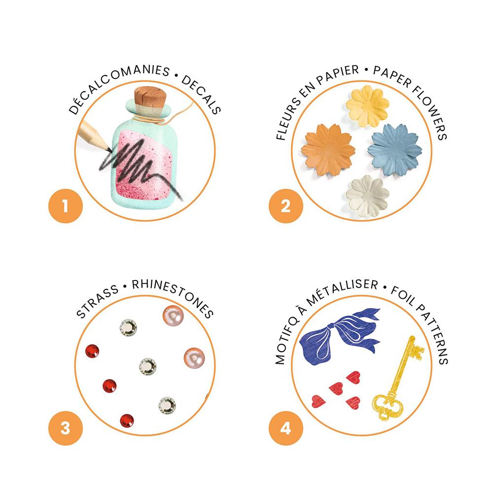 Κατασκευάστε εντυπωσιακές χειροτεχνίες με 3D εφέ μέσα από 4 διαφορετικές δραστηριότητες: ξύσιμο με χαλκομανίες, δημιουργία τρισδιάστατων λουλουδιών, τοποθέτηση αυτοκόλλητων κρυστάλλων και στόλισμα με φύλλα χρυσού! Στο τέλος αυτής της δημιουργικής διαδικασίας, τα παιδιά θα έχουν συνθέσει 4 τρισδιάστατες εικόνες με σκηνές από το κλασσικό παραμύθι της Τοσοδούλας που μπορούν να χρησιμοποιήσουν για να στολίσουν το δωμάτιο. Ένα ολοκληρωμένο σετ 4 σε 1 χειροτεχνιών της εταιρίας Djeco, που καλλιεργεί την δημιουργικότητα των παιδιών και αναπτύσσει δεξιότητες προσοχής, συγκέντρωσης και λεπτής κίνησης. Το σετ περιλαμβάνει 4 κάρτες, 30 λουλούδια και 1 φύλλο με αυτοκόλλητα διπλής όψης, 4 φύλλα με χαλκομανίες και 1 ξύλινο μολύβι, 5 φύλλα χρυσού και 4 σελίδες με σχέδια, 100 αυτοκόλλητα κρυσταλλάκια, καθώς και εικονογραφημένες οδηγίες.