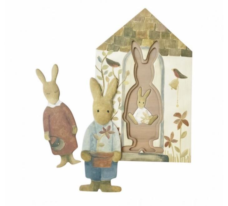 Πολυεπίπεδο παζλ ! Αφαιρέστε το κουνέλι πατέρα από το σπίτι και εμφανίζεται η μητέρα. Φεύγει και εμφανίζεται το μωρό κουνέλι. Από μεγάλο σε μικρό ή το αντίστροφο… εκπαιδευτικό και πολύ διασκεδαστικό! Αναγνωρίστε τα επίπεδα και τα μεγέθη!