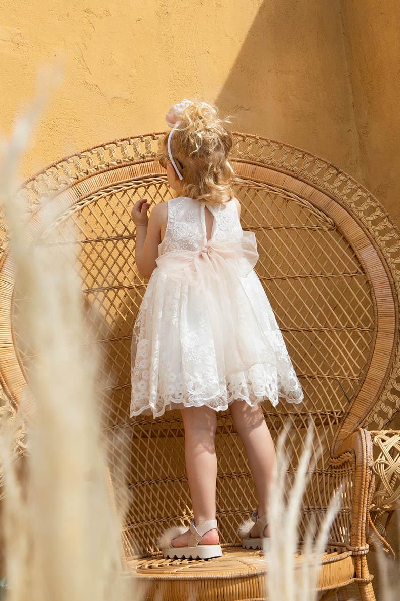 Η Eirini είναι ένα ρομαντικο αμανικο δαντελενιο off white φόρεμα εξαιρετικης ποιοτητας.ο στολισμος του αποτελειται απο χειροποιητο dusty pink φιογκο με κεντημενες περλες στη μεση. Ο τεραστιος τουλινος φιογκος στο πισω μερος θα σας μαγεψει.Συνοδευεται απο handmade στεκα για το κεφαλι.