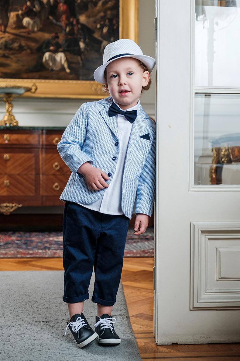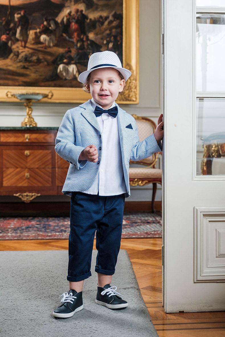 Αποτελείται από το νέο σιέλ σακάκι με τσεπάκι για μαντηλάκι, το λευκό πουά πουκάμισο και το μπλε παντελόνι καπαρντίνα. Συνοδεύεται από το μπλε παπιγιόν και το μαντήλη, το λευκό καβούρι και την μπλε ζώνη.