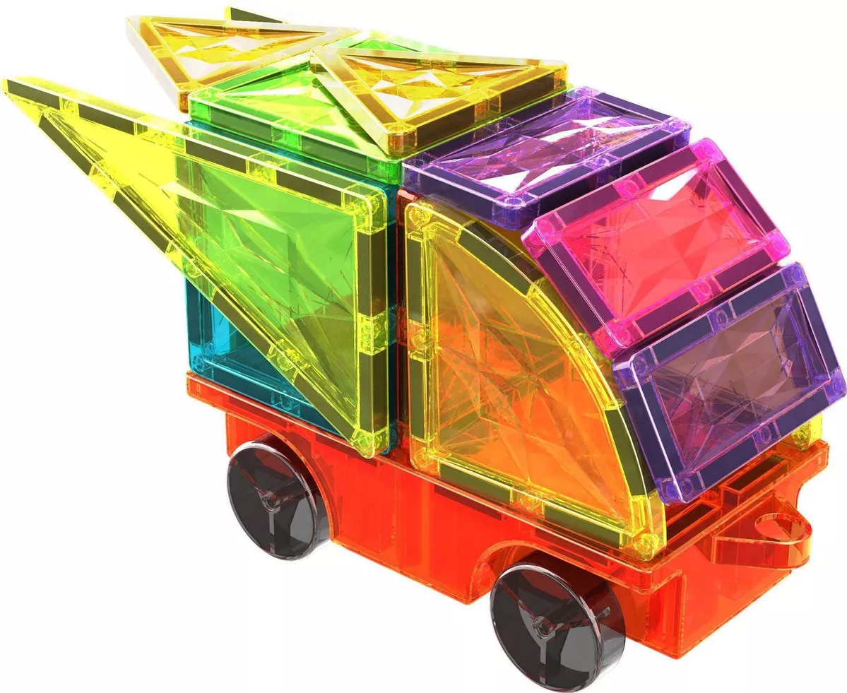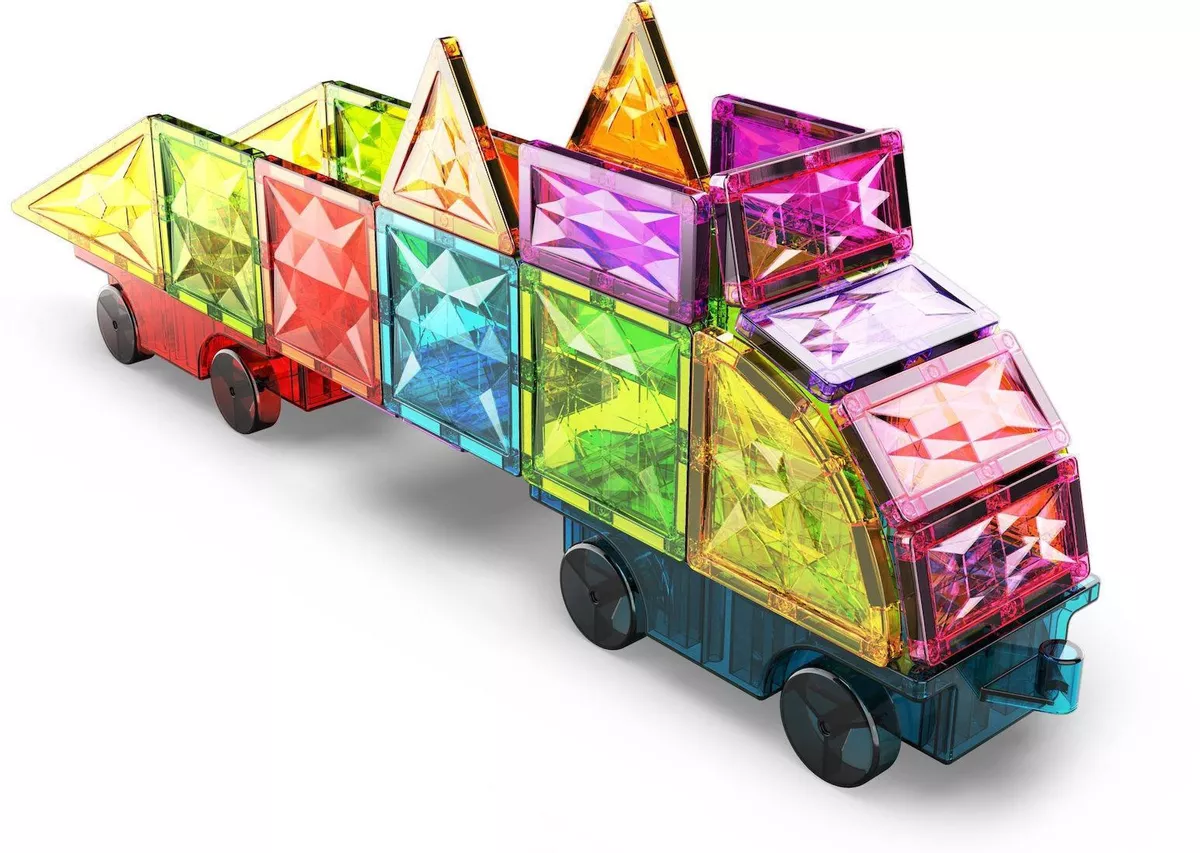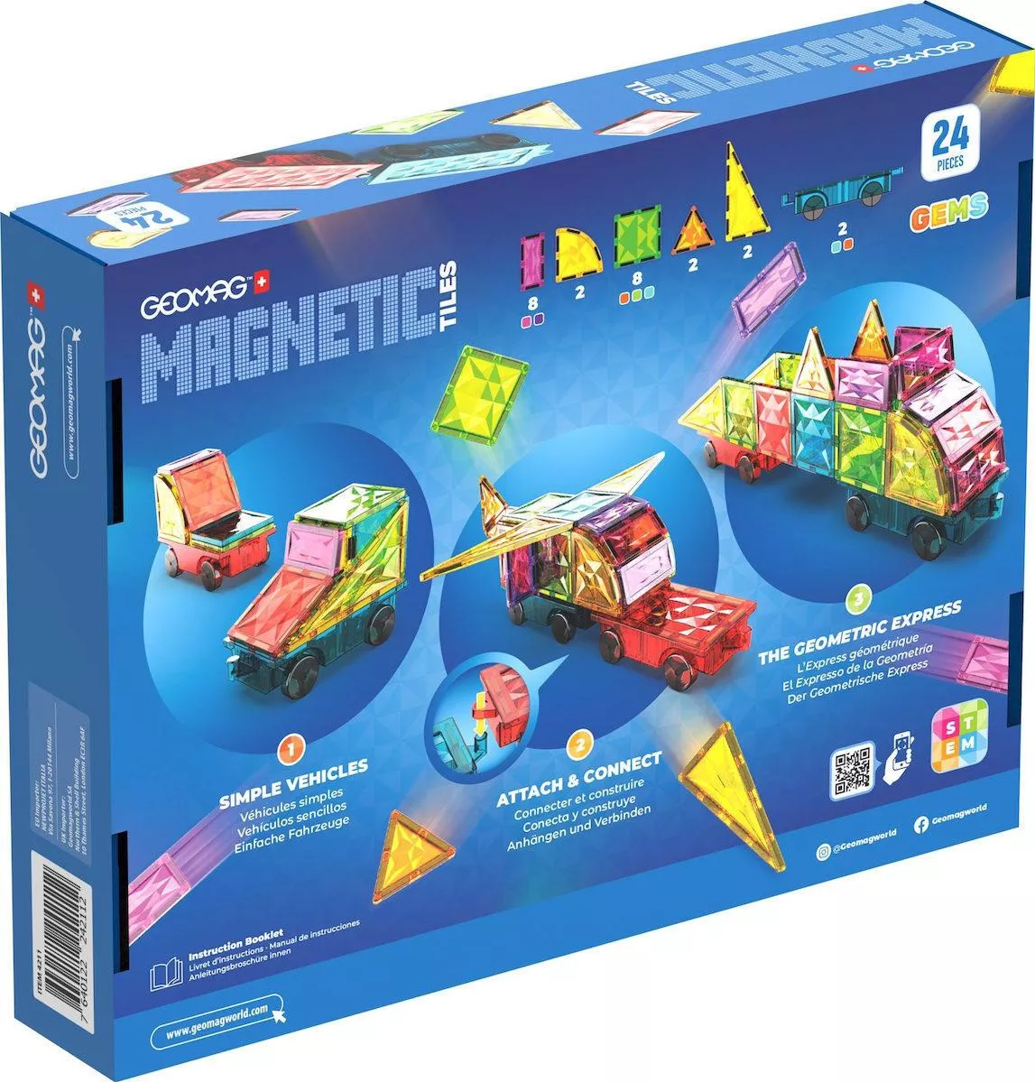 Το GEOMAG MAGNETIC TILES είναι μια νέα πλατφόρμα παιχνιδιού που βασίζεται σε διασκεδαστικά μαγνητικά πλακίδια διαφόρων γεωμετρικών σχημάτων, για την προσχολική ηλικία. Χάρη στα μαγνητικά πλακίδια Geomag, τα παιδιά μπορούν να απελευθερώσουν τη φαντασία τους, δημιουργώντας δυναμικά διαρκώς μεταβαλλόμενα περιβάλλοντα παιχνιδιού και σενάρια: κτίρια, σπίτια, αγροκτήματα, κάστρα και φυσικά τοπία. Αυτό επιτρέπει στα παιχνίδια τους να ζωντανέψουν τη φαντασία τους, μεταμορφώνοντας το υπνοδωμάτιο τους σε μια διασκεδαστική και ασφαλή σκηνή για απεριόριστες περιπέτειες. Τα μαγνητικά πλακίδια Geomag διαθέτουν αυθεντική υφή διαμαντιού σε φωτεινές και ημιδιαφανείς αποχρώσεις που μοιάζουν με πολύτιμα πετράδια (Gem). Τα νέα μαγνητικά πλακίδια σχεδιάστηκαν και κατασκευάστηκαν προσεκτικά και αριστοτεχνικά από την Geomag μέσα από δεκαετίες εμπειρίας και τεχνολογικής γνώσης. Η Geomag, διάσημος κορυφαίος κατασκευαστής μαγνητικών κατασκευών και παιχνιδιών για περισσότερα από 25 χρόνια, προσφέρει και προωθεί μια νέα μοναδική εμπειρία παιχνιδιού υψηλής ποιότητας, εστιασμένης στην ασφάλεια. Το σετ παιχνιδιού 4211 περιλαμβάνει 24 μαγνητικά πλακίδια που συνδυάζουν ένα μείγμα 5 σχημάτων: τετράγωνο, ισόπλευρο τρίγωνο, ορθογώνιο, μακρύ ορθογώνιο τρίγωνο και γωνιακή καμπύλη. Το σετ περιλαμβάνει 2 μαγνητικές βάσεις τροχών με δυνατότητα σύνδεσης για να κινητοποιήσετε τις δημιουργίες σας. μπορείτε να κατασκευάσετε απλά μεμονωμένα οχήματα, να τα συνδέσετε και να τα συνδέσετε ή να τα ενώσετε μέσω του μαγνητισμού των πλακιδίων για να φτιάξετε ένα Geometric Express. Το σετ αποτελείται από μια σειρά 7 λαμπερών διαφανών χρωμάτων GEMS.