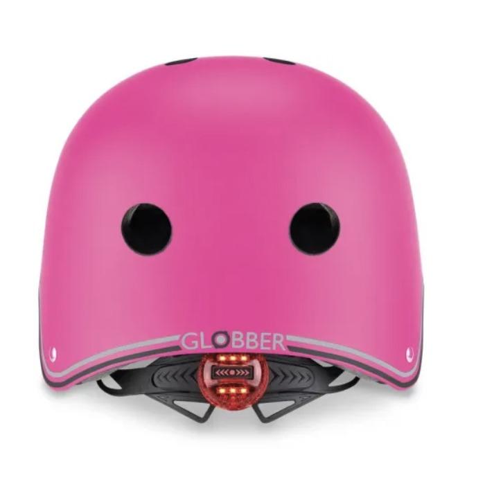 Globber Helmet Primo Lights – Deep Pink (505-110): XS/S (48-53cm).Κράνος προστασίας με αναλάμπον LED ασφαλείας.Ρυθμίστε εύκολα την εφαρμογή από το κουμπί δακτυλίου. Κέλυφος με ανθεκτική δομή EPS. Μαξιλαράκια αφρού 7mm για μέγιστη άνεση και ασφάλεια.