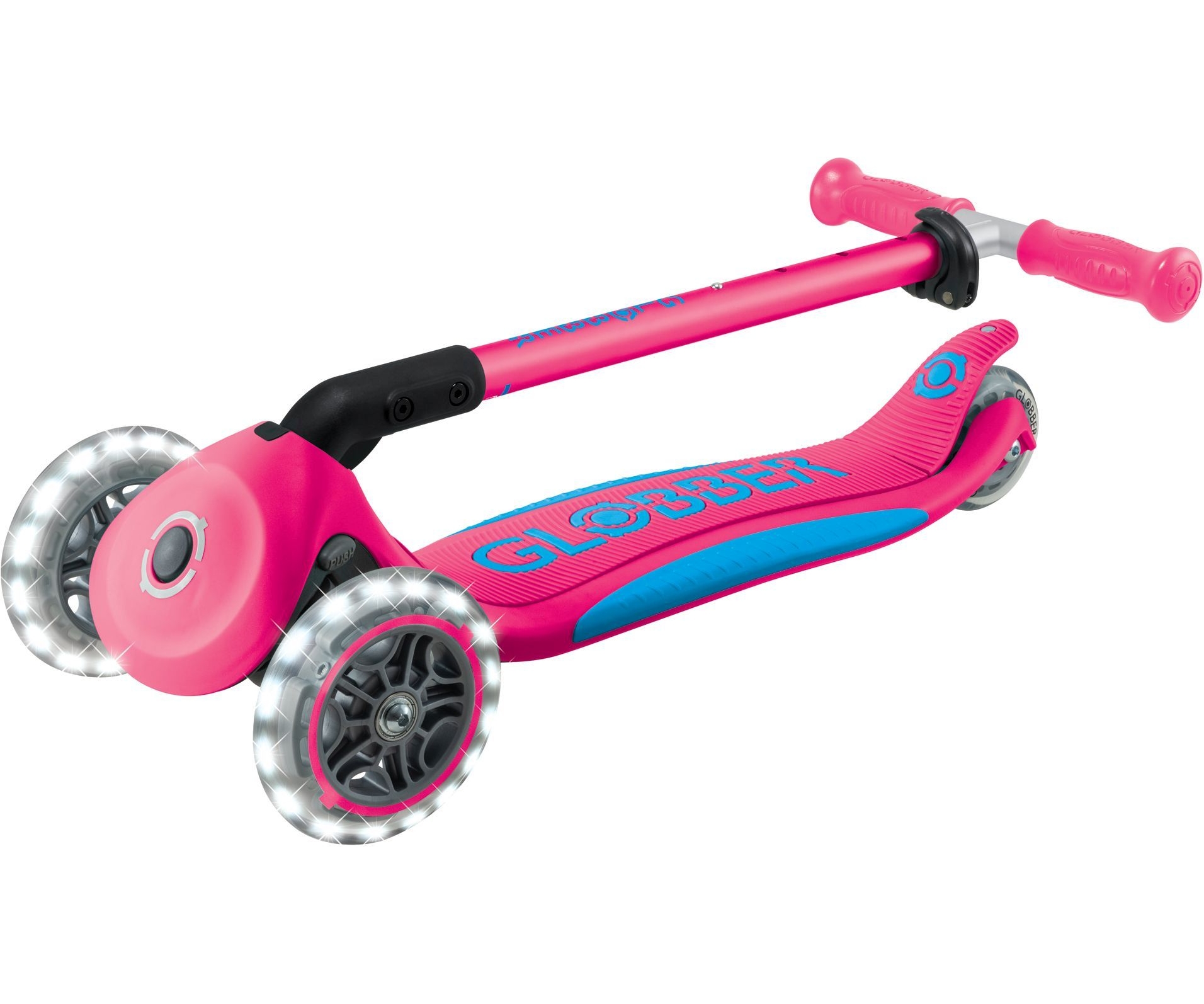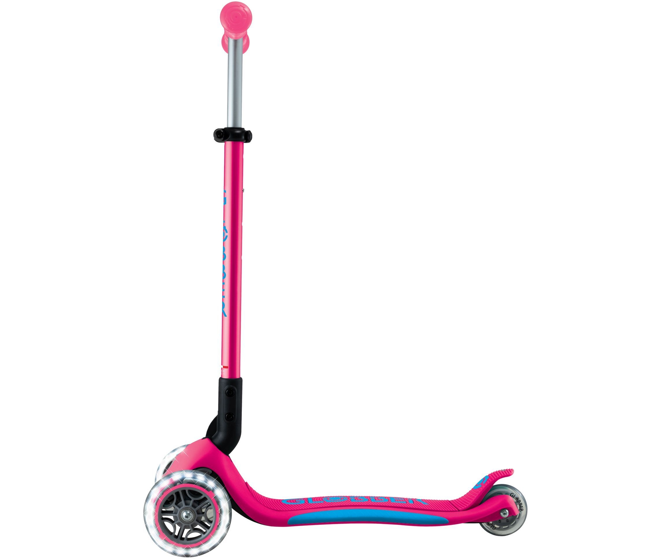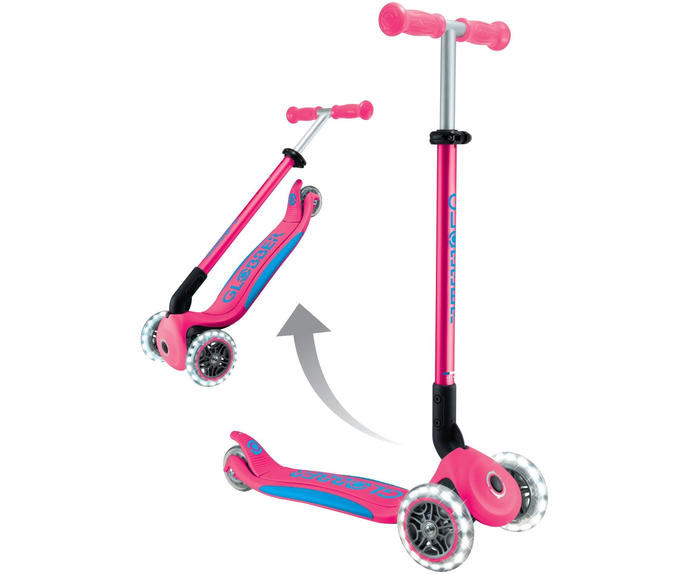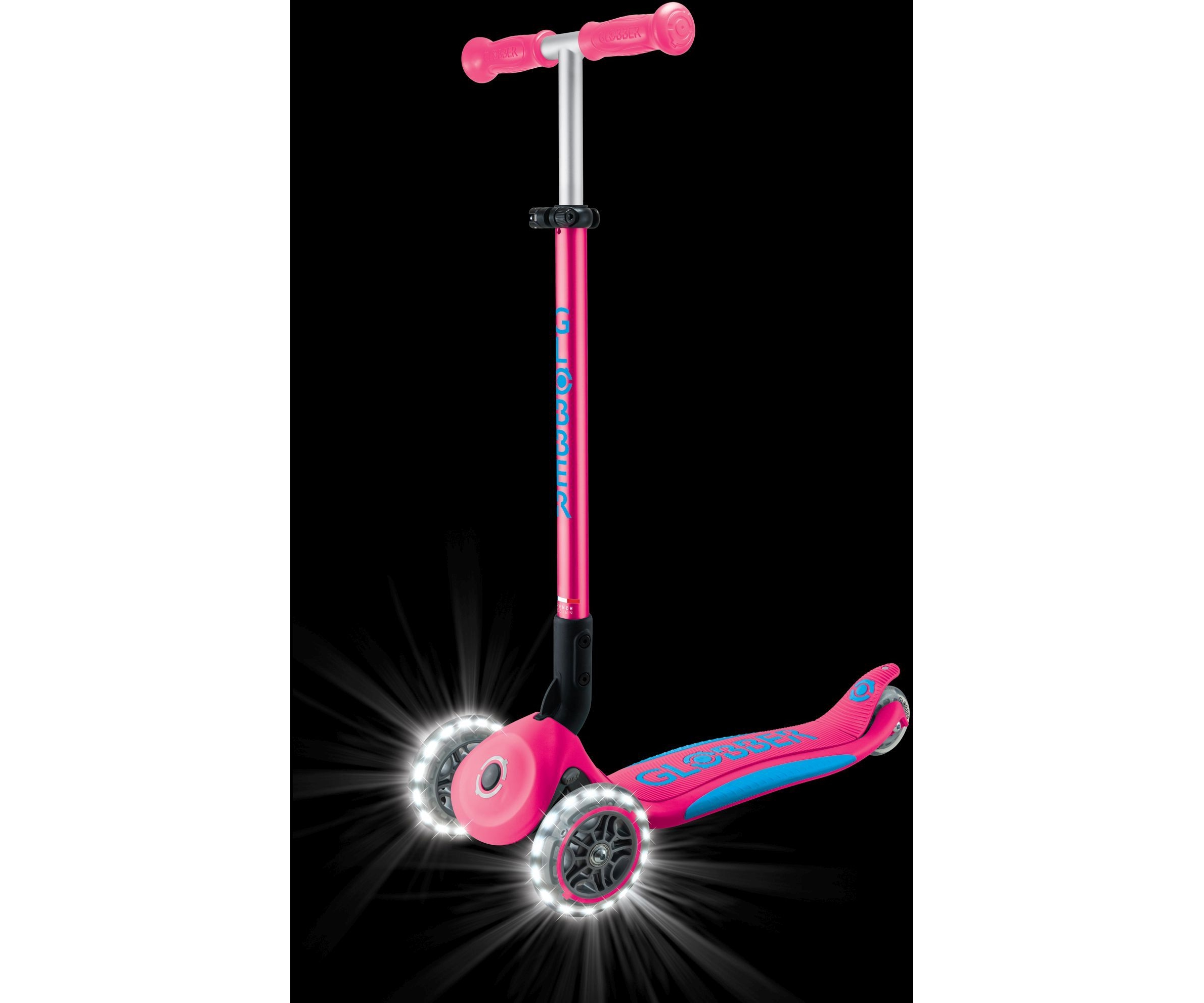 Φωτιζόμενο σκούτερ 3 τροχών με πατενταρισμένο σύστημα αναδίπλωσης της Globber. Το σκούτερ διπλώνει σε λειτουργία τρόλεϊ πατώντας ένα ασφαλές κουμπί. Μεταφέρετε το, κυλήστε ή αποθηκεύστε το βολικά μετά το χρόνο παιχνιδιού & διασκέδασης!