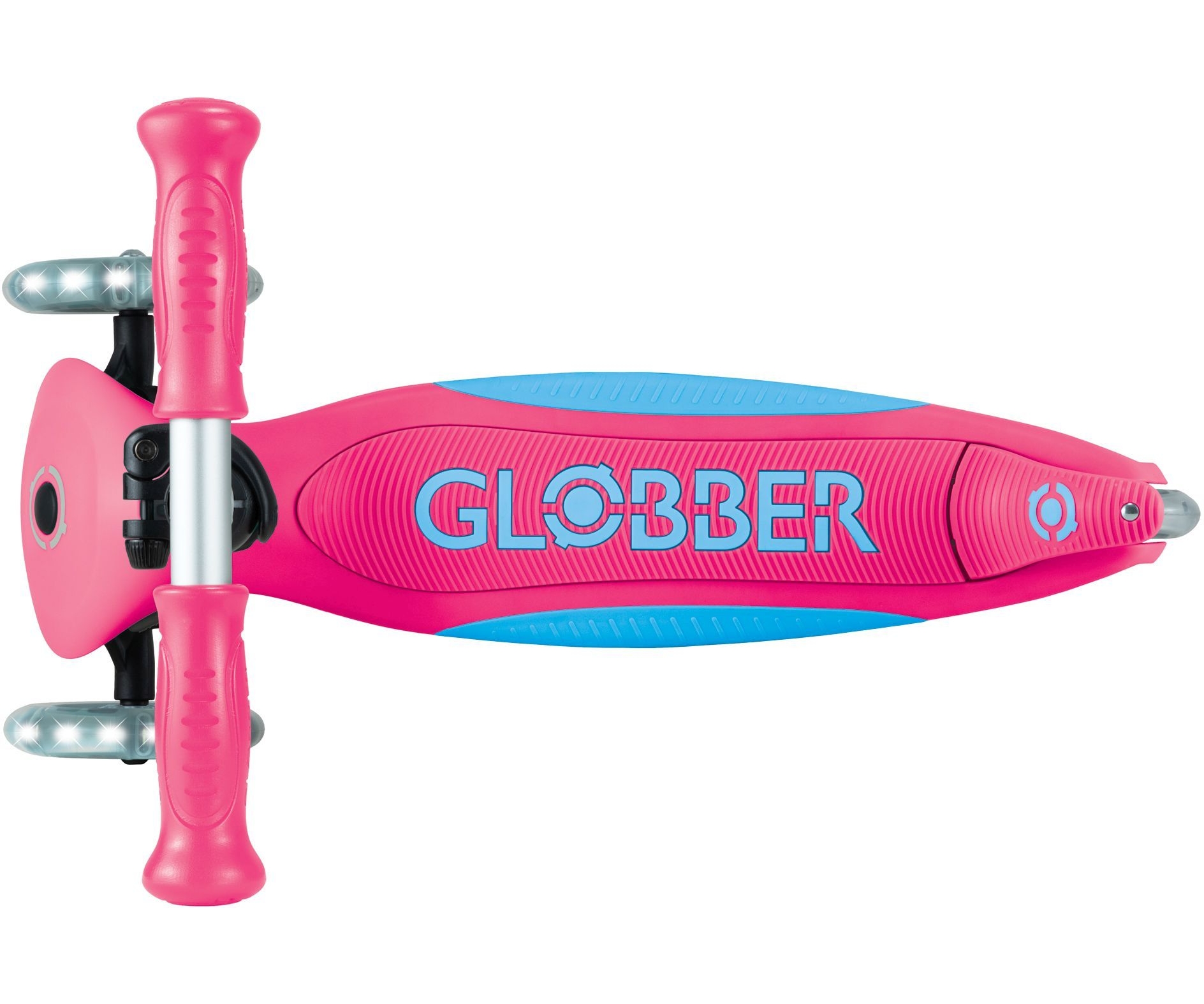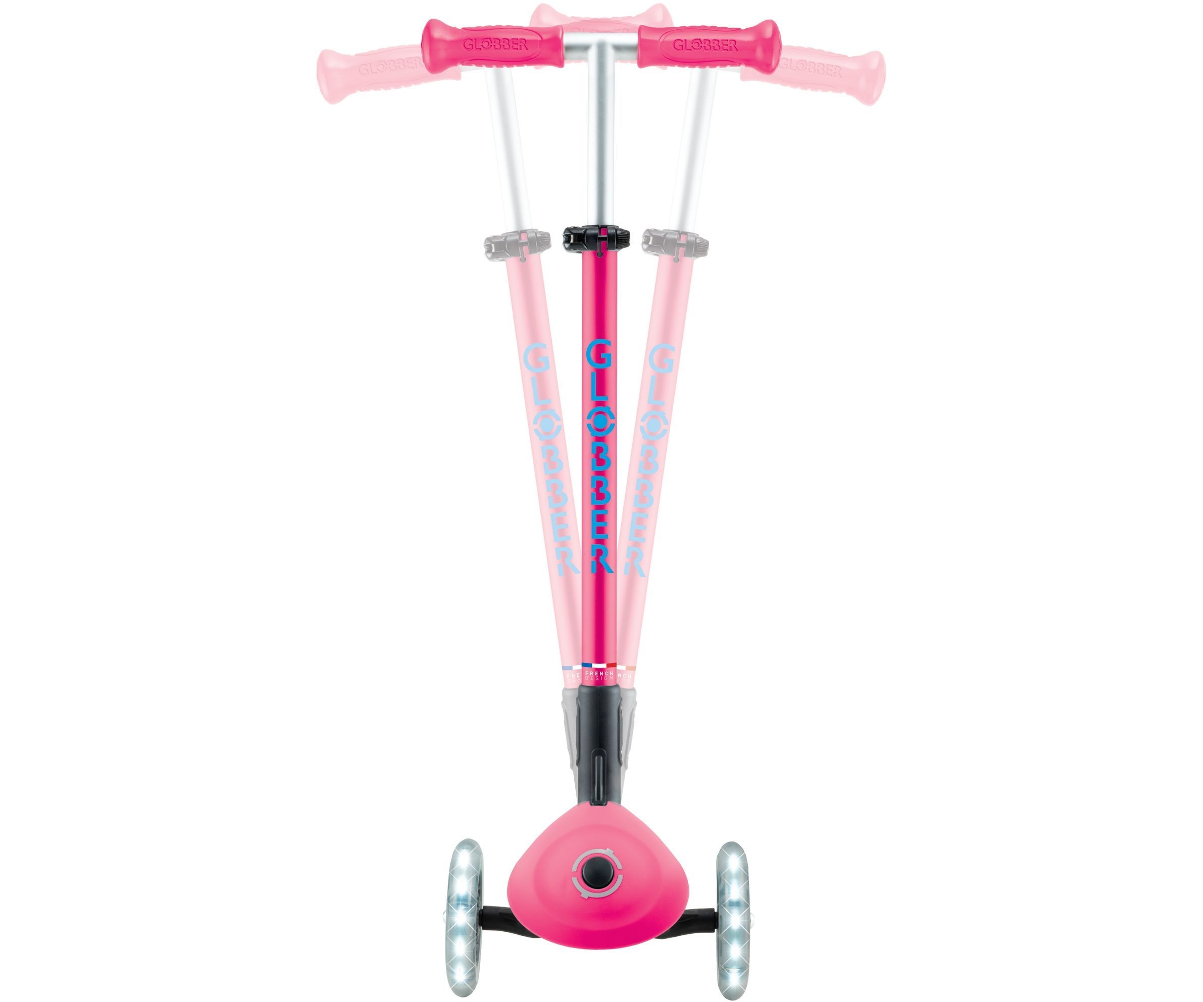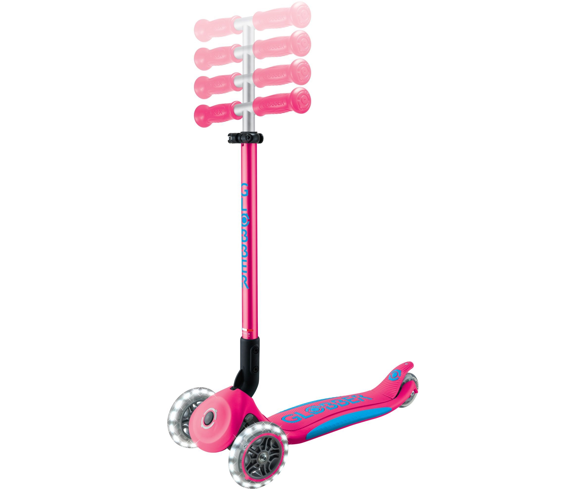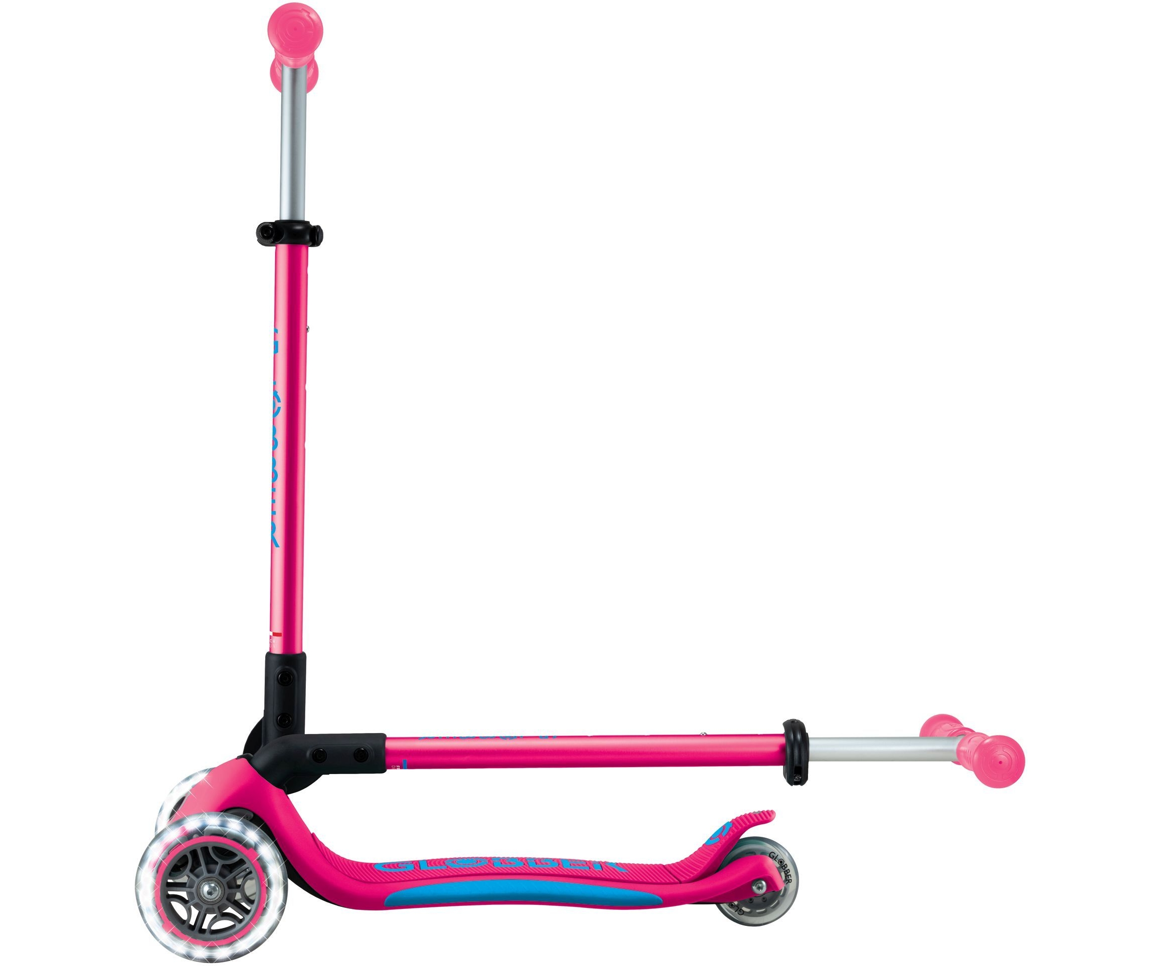 Φωτιζόμενο σκούτερ 3 τροχών με πατενταρισμένο σύστημα αναδίπλωσης της Globber. Το σκούτερ διπλώνει σε λειτουργία τρόλεϊ πατώντας ένα ασφαλές κουμπί. Μεταφέρετε το, κυλήστε ή αποθηκεύστε το βολικά μετά το χρόνο παιχνιδιού & διασκέδασης!