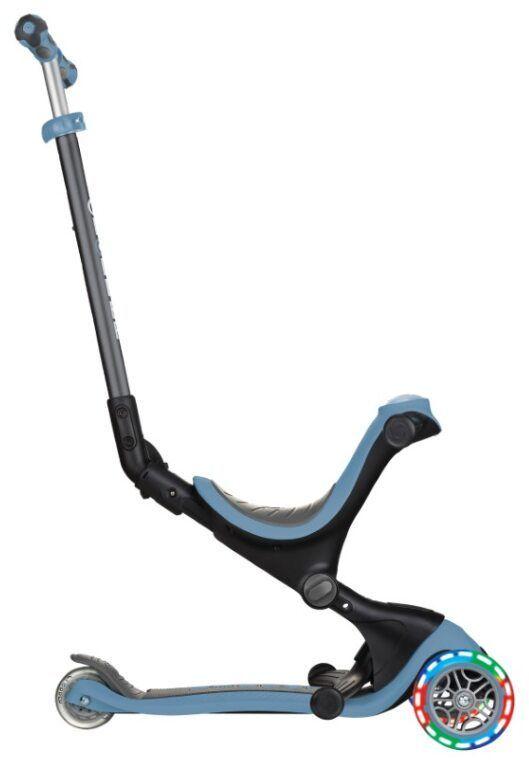 Globber Scooter Go Up Deluxe Lights Ash Blue (646-200). Έξυπνη υποδοχή αποθήκευσης για το υποπόδιο. Μακριά άνετη σέλα που ρυθμίζεται σε 3 ύψη από μαλακό υλικό αφρώδες υλικό EVA. Η αλλαγή ύψους πραγματοποιείται εύκολα με την χρήση του ειδικού μοχλού.