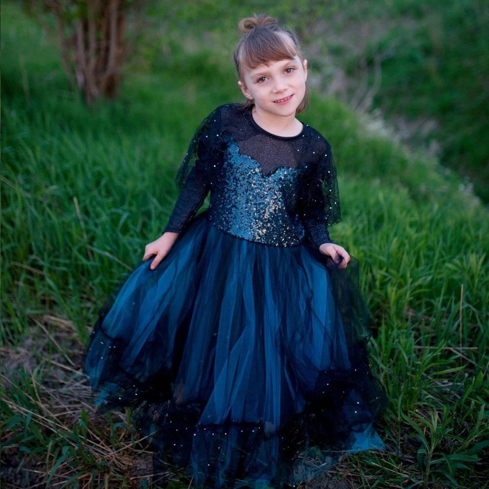 Στολή Μάγισσας από την εταιρεία Great Pretenders. Ένα υπέροχο φόρεμα με μακριά μανίκια σχεδιασμένο σε τόνους σκούρου μπλε και μαύρο με ιριδίζουσες πούλιες στο μπούστο που μετατρέπονται σε πλέγμα. Μαύρη δαντέλα πέφτει στους ώμους δημιουργώντας την αίσθηση του ιστού της αράχνης. Η φούστα της έχει βολάν από μαύρη δαντέλα στο κάτω μέρος και μία στρώση από σκούρο μπλε τούλι. Κατάλληλη για ηλικίες 7-8 ετών.