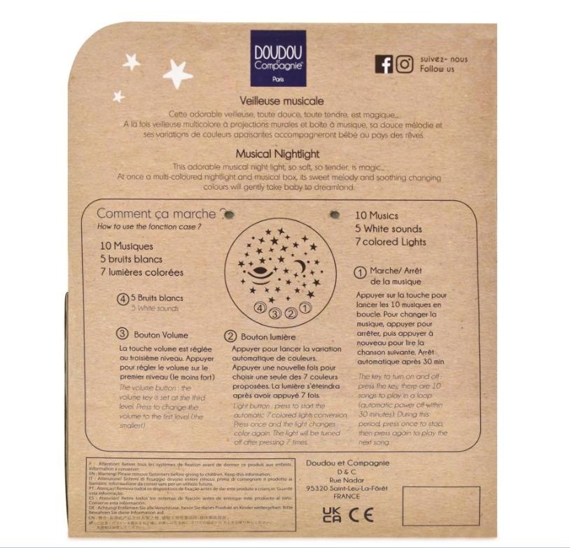 Ένα παραμυθένιο και απίστευτα χαριτωμένο μουσικό φωτάκι νυκτός που θα νανουρίσει απαλά το μωράκι σας, οδηγώντας το στον κόσμο των ονείρων. Το παιχνίδι έχει 10 μελωδίες, 3 λευκούς ήχους και 7 χρωματιστά φωτάκια, λειτουργία προτζέκτορα και ρυθμιζόμενη ένταση ήχου 3 διαβαθμίσεων.