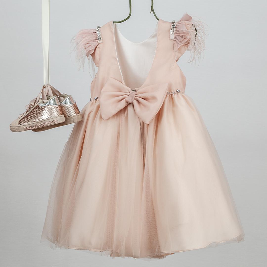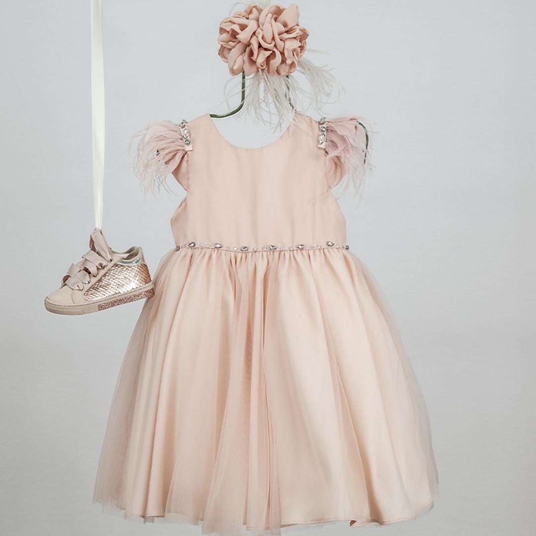 Kiki-9311: Η Kiki είναι ένα girly chic φόρεμα από τούλι εξαιρετικής ποιότητας σε light old-pink χρώμα. Διακοσμημένο με φτερά, πούπουλα και κρύσταλλα Swarovski στα petit μανίκια του ρούχου που του δίνουν μια ρομαντική διάθεση. Ο τεράστιος φιόγκος στο πίσω μέρος του φορέματος το στολίζει και του δίνει μία ευχάριστη αίσθηση. Η κορδέλα για το κεφάλι ολοκληρώνει την εμφάνισή σας.