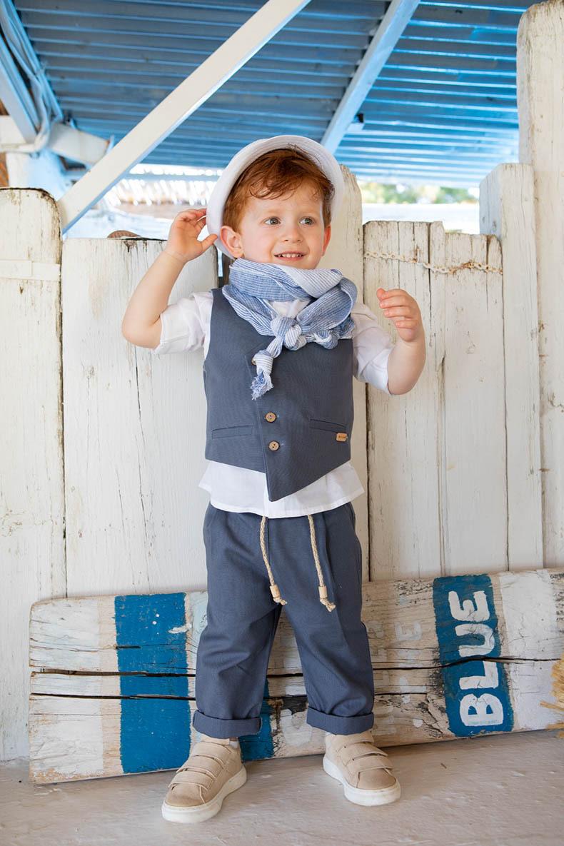 Ο Kiriakos είναι ένα chic βαπτιστικό κοστούμι. Συνδυάζει το μπλε ρουά παντελόνι με το γιλέκο ίδιας ποιότητας και με το λευκό βαμβακερό πουκάμισο. Αξεσουάρ είναι το σχοινί για ζώνη, το σιέλ ριγέ φουλάρι, το λευκό μαντήλι και το λευκό καβούρι του