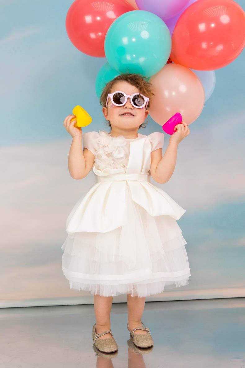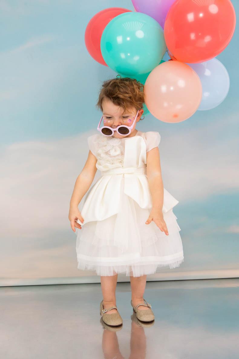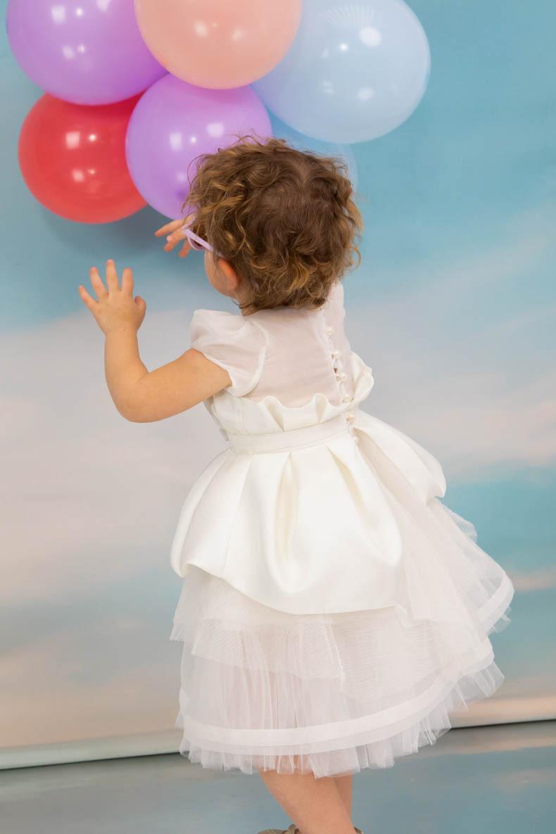 Exclusive εκρού φόρεμα σε layering στυλ με balloon μανίκια. Το μπούστο συνδυάζει στολισμό από χειροποίητα λουλούδια με σατέν ύφασμα να δημιουργεί πιέτες. Αξεσουάρ: Στέκα με στρας και λουλούδια. Σύνθεση υφασμάτων: Cotton tulle Γαλλίας, Κρεπ σατέν Γαλλίας, οργάντζα Γαλλίας. Ελληνικής ραφής.
