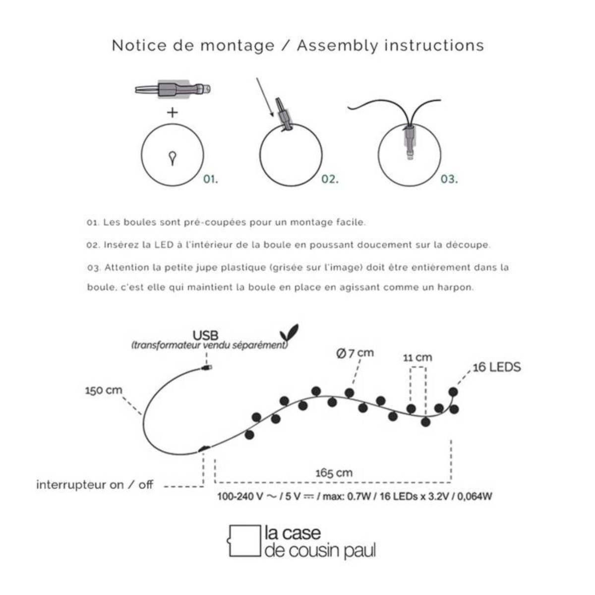 Η χειροποίητη γιρλάντα με 16 φωτάκια της La Case de Cousin Paul συνδυάζει κομψότητα και τεχνολογία σε ένα διακοσμητικό που μαγεύει. Με μπαλίτσες από νήμα, πλεγμένες στο χέρι, και διακριτικό φωτισμό, αποτελεί την τέλεια προσθήκη για ένα ζεστό, φιλόξενο περιβάλλον.