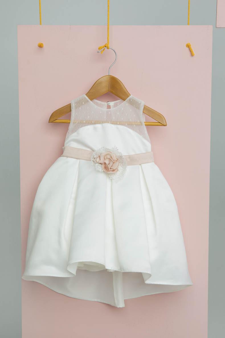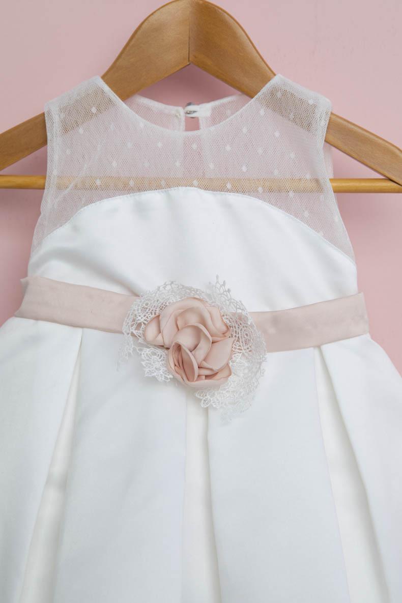 Εκρού σατέν φόρεμα με old pink λεπτομέρειες στην ζώνη και στο αξεσουάρ. Πουά τούλι στο τελείωμα του μπούστου. Αξεσουάρ: Old pink σατέν κορδέλα με φιόγκο. Σύνθεση υφασμάτων: Κρεπ σατέν Γαλλίας σε απόχρωση εκρού και old pink, 100% Cotton, Πουά τούλι Γαλλίας. Ελληνικής ραφής.