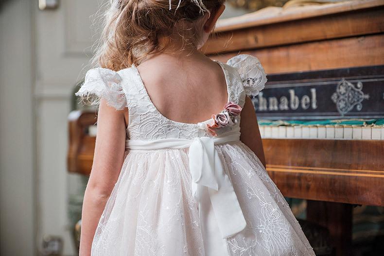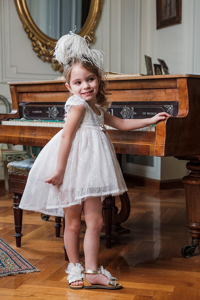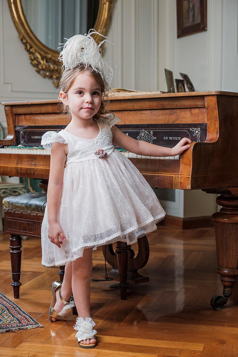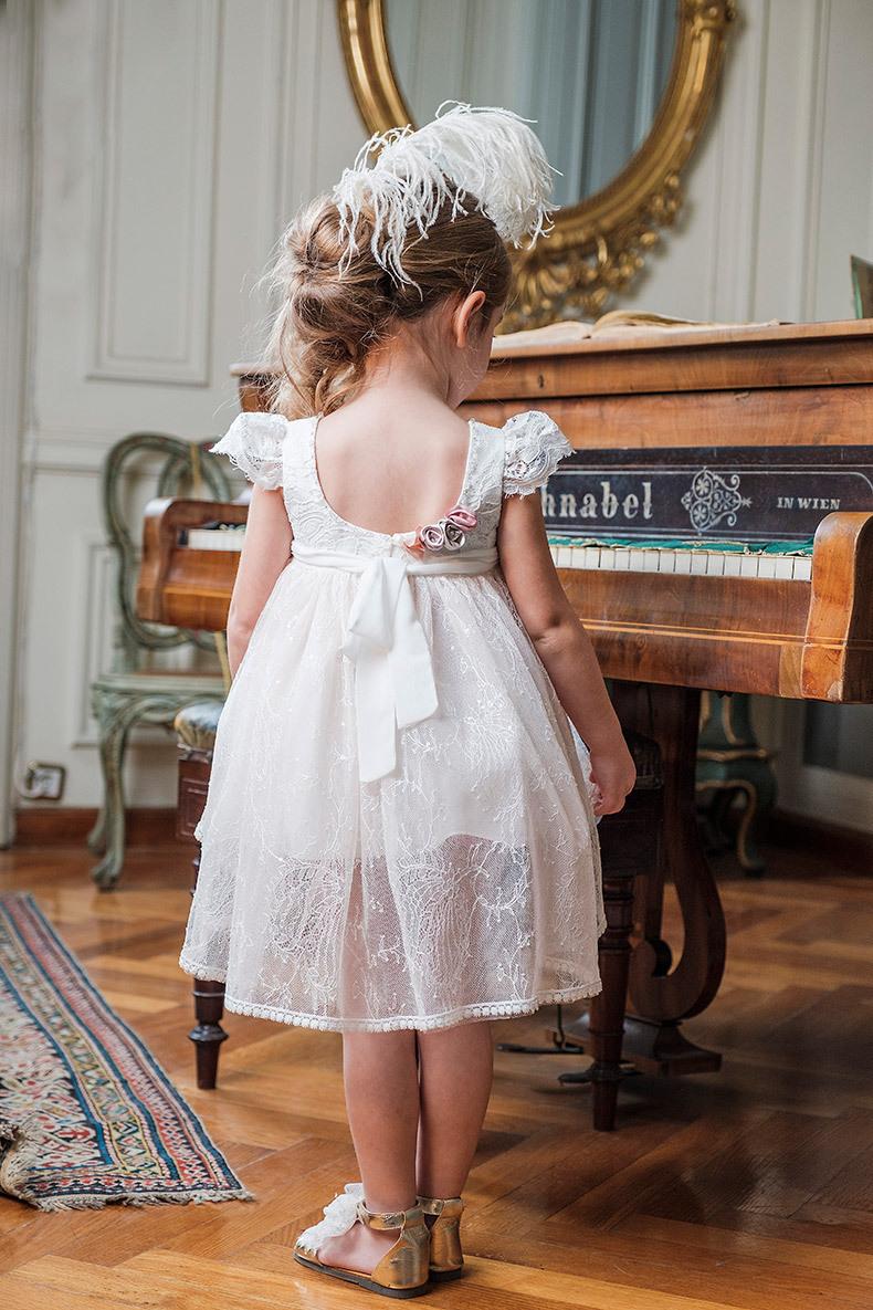 Η Lenia είναι ένα άερινο ασύμμετρο φόρεμα βάπτισης με μανίκι από εξαιρετική δαντέλα και γαλλική βαμβακερή τρέσα στα τελειώματα του ρούχου.