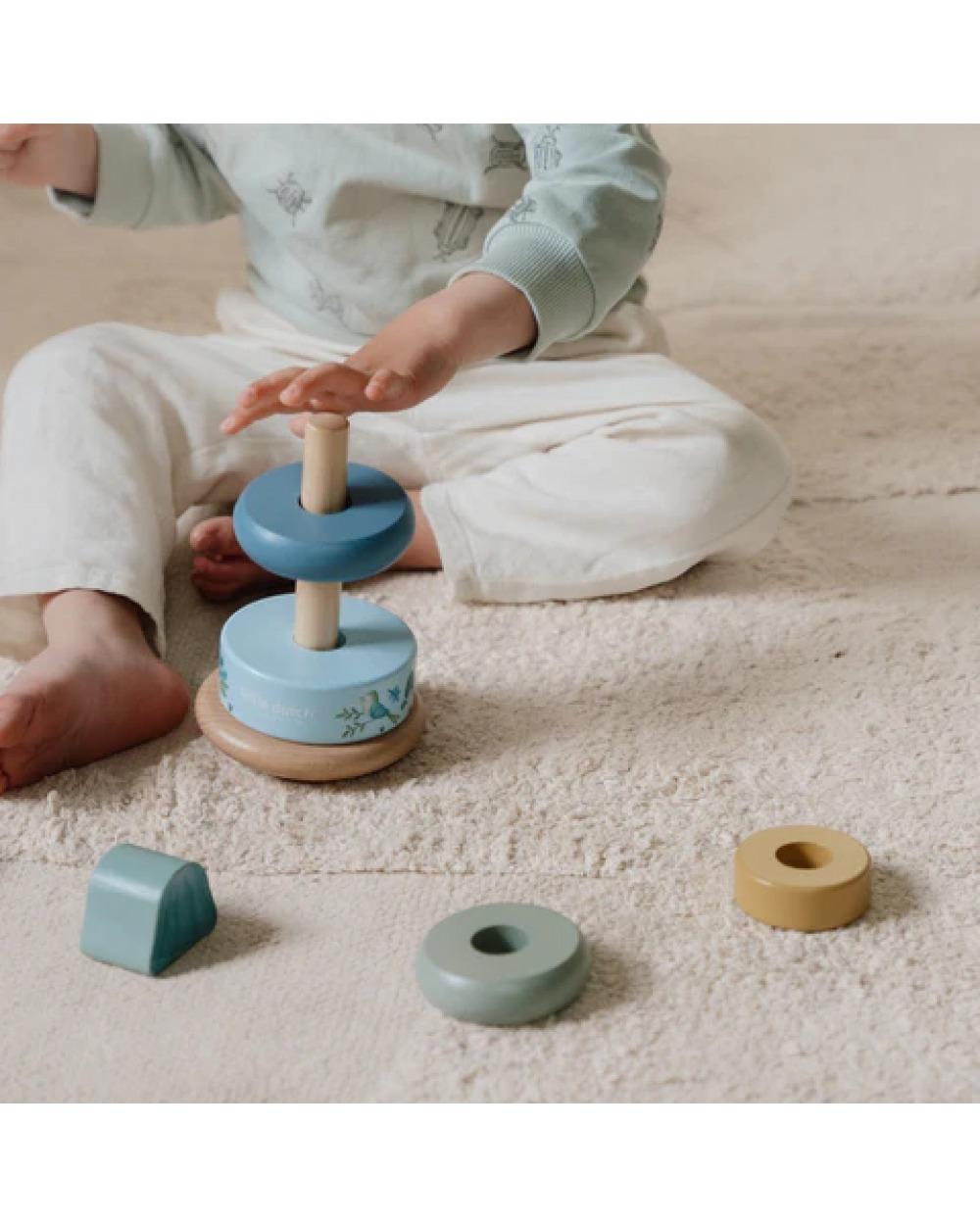 Τα παιδιά ενθαρρύνονται να τοποθετούν τους ξύλινους κρίκους στη σωστή σειρά και να τους στοιβάζουν στον πύργο.